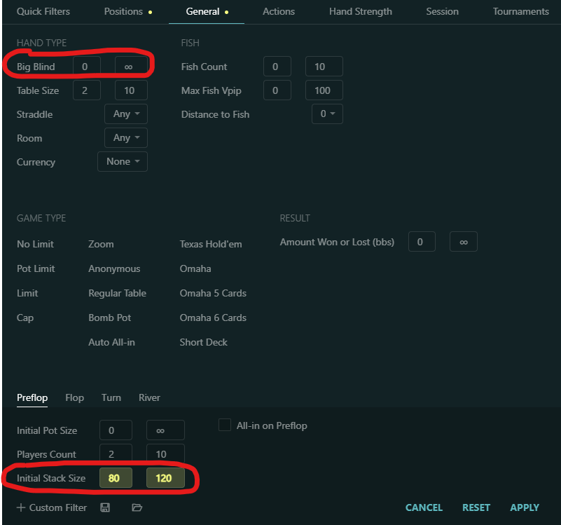 Under “General”, you can also limit the hand selection to specific stakes if you want (“Big Blind”) and initial stack sizes. The latter makes a lot of sense, because that way you prevent showing situations where much shorter or much deeper stacks are considered. Here, we want to look at stacks around 100bb, so we limit the selection to 80bb – 120bb.