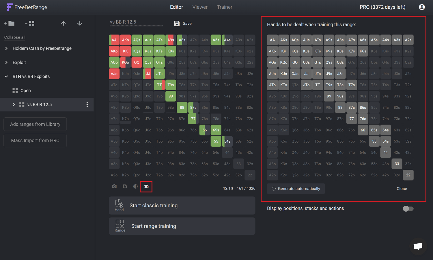 As you can see, the smart script already selected only hands in range + the closest hands outside the range, for efficient training. You can modify the dealing coverage as you wish.