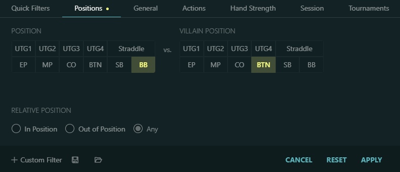 For example, we want to examine how the population plays their BB against a BTN open range. We go to “Positions”, and select “BB” for our position (because that’s the position we want to see the player pool’s stats for) and “BTN” for villain’s position.