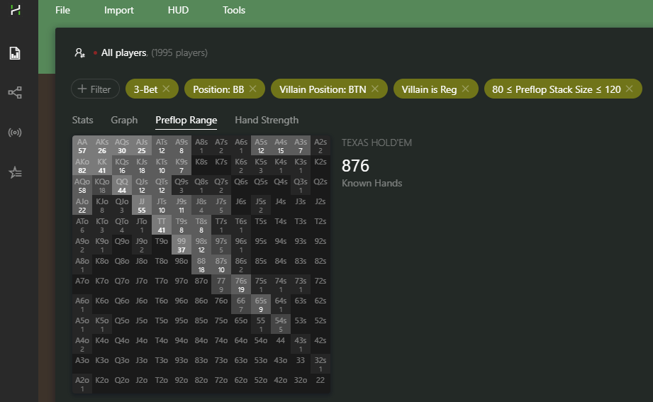 Lastly, we want to go back to “Quick Filters” to select in which spot we want to have the stats shown. Being the BB against the BTN, we want to start by looking at the population’s range when they’re facing an open raise and are 3-Betting. So we click on “3-Bet”. Later, when analyzing the calling range against a BTN open, we would select “Call Open Raise” instead. Lastly, we want to make sure we select “Villain is Reg” as we want to look at play vs other regulars to make sure the preflop sizings are not too out of the ordinary. Then we hit apply.