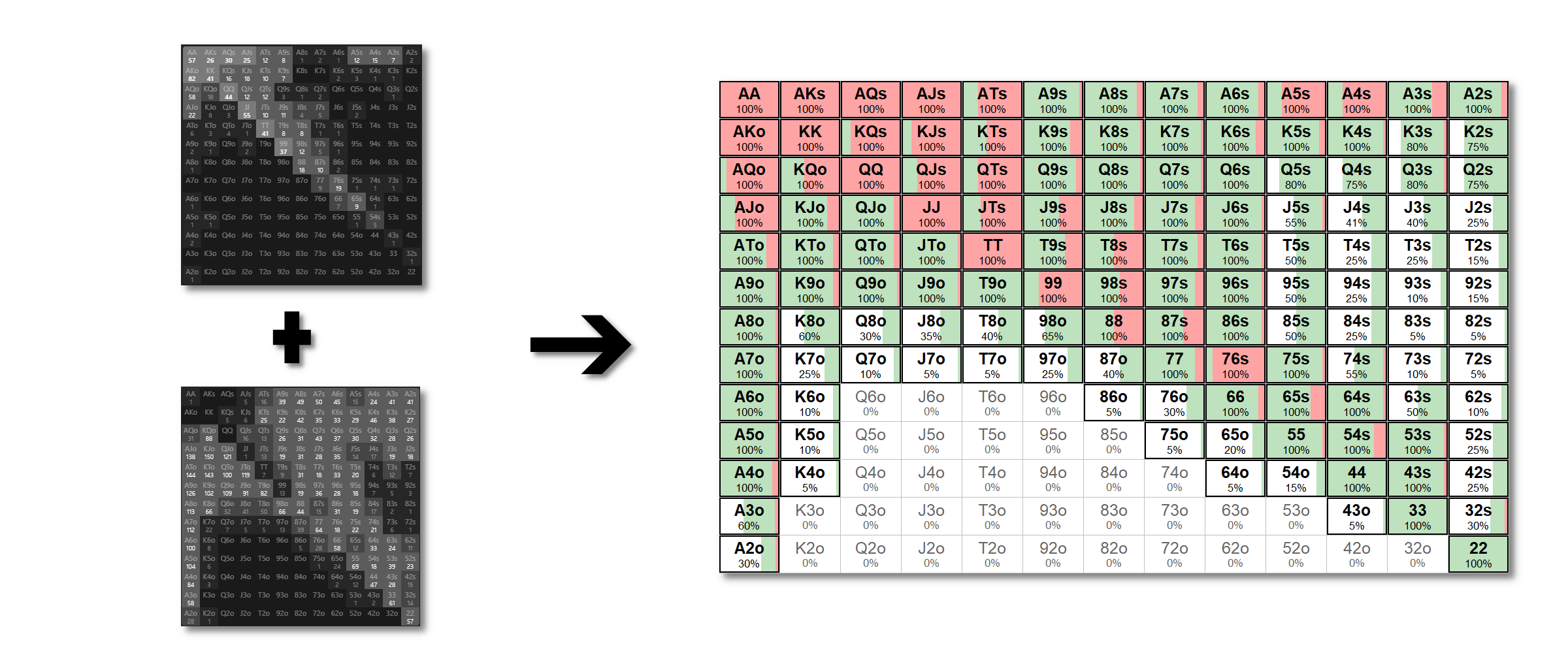 The other component is the range composition. Which is based on the distribution of hands that perform the action we’re looking at. And that will not be a quantitative component. This means it will not be 100% exact, but rather a qualitative approach to approximate the range composition that the population plays in this spot.