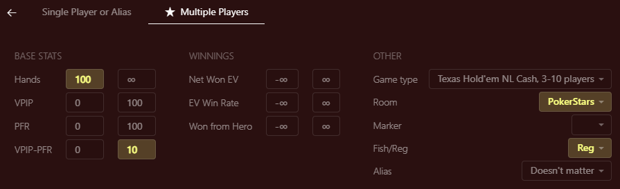 Here, you can choose to analyze a specific player or multiple players. When looking at a player pool, we want to analyze multiple players. You can set specific filters to fit the player pool you want to analyze. For example, it makes sense to distinguish between regulars and fish, which you can do on the right. For this one, we want to look at the regulars. To make sure the players have a decent sample size, we’ll also require them to have played at least 100 hands in this database. And to make sure we really target regulars, we’ll filter for players whose VPIP and PFR differ no more than 10%. Also, you might want to single out a specific poker site. Because tendencies can differ based on the dynamics and especially on the rake structure of a site. Let’s look at Pokerstars in this example. We also want to select the correct game type, but other than that, we don’t need any more filters. So we’ll hit apply.