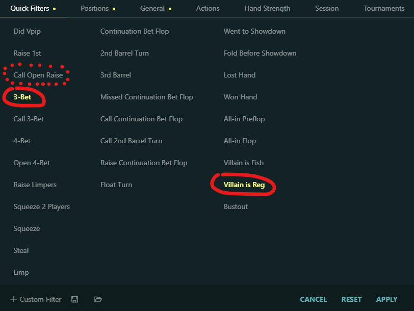 Lastly, we want to go back to “Quick Filters” to select in which spot we want to have the stats shown. Being the BB against the BTN, we want to start by looking at the population’s range when they’re facing an open raise and are 3-Betting. So we click on “3-Bet”. Later, when analyzing the calling range against a BTN open, we would select “Call Open Raise” instead. Lastly, we want to make sure we select “Villain is Reg” as we want to look at play vs other regulars to make sure the preflop sizings are not too out of the ordinary. Then we hit apply.