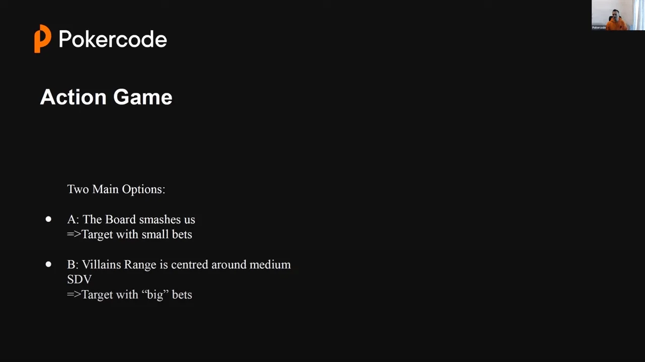 - His range is concentrated around SDV hands, with which he decided to skip 1-2 streets of value, but is ready to call. => Then we need to bet big.