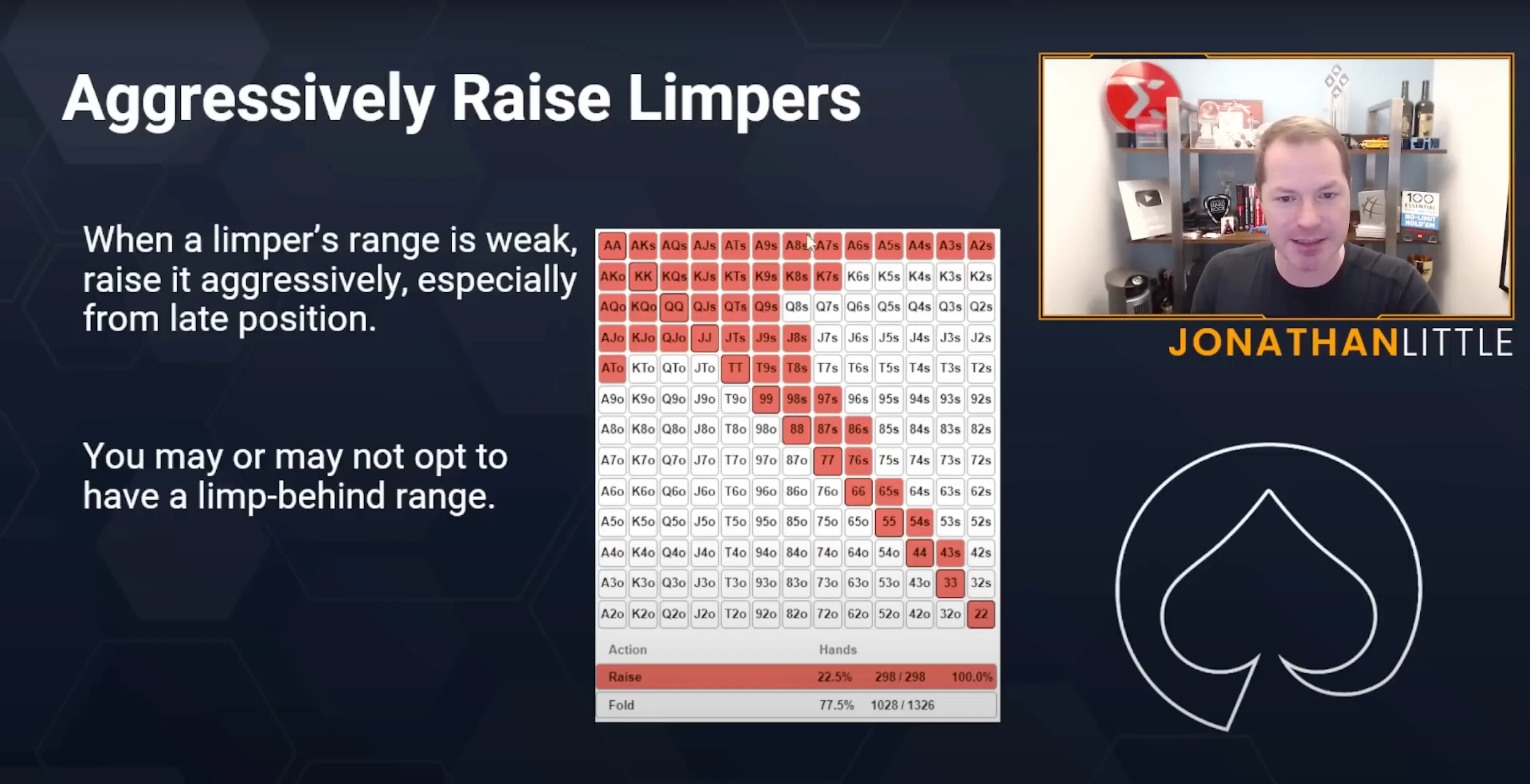So, what I would generally recommend is considering what the limper's range looks like for their medium-strength hands and then raise with all those hands plus all the better hands. Perhaps you can get even a little bit wider if you feel inclined because the bottom portion of your raising range, while it is going to be behind their limping and calling range, it's going to be fine because your range overall contains Aces, Kings, Queens, Jacks, Tens, Ace-King, Ace-Queen, etc., and those hands are going to crush the limpers.