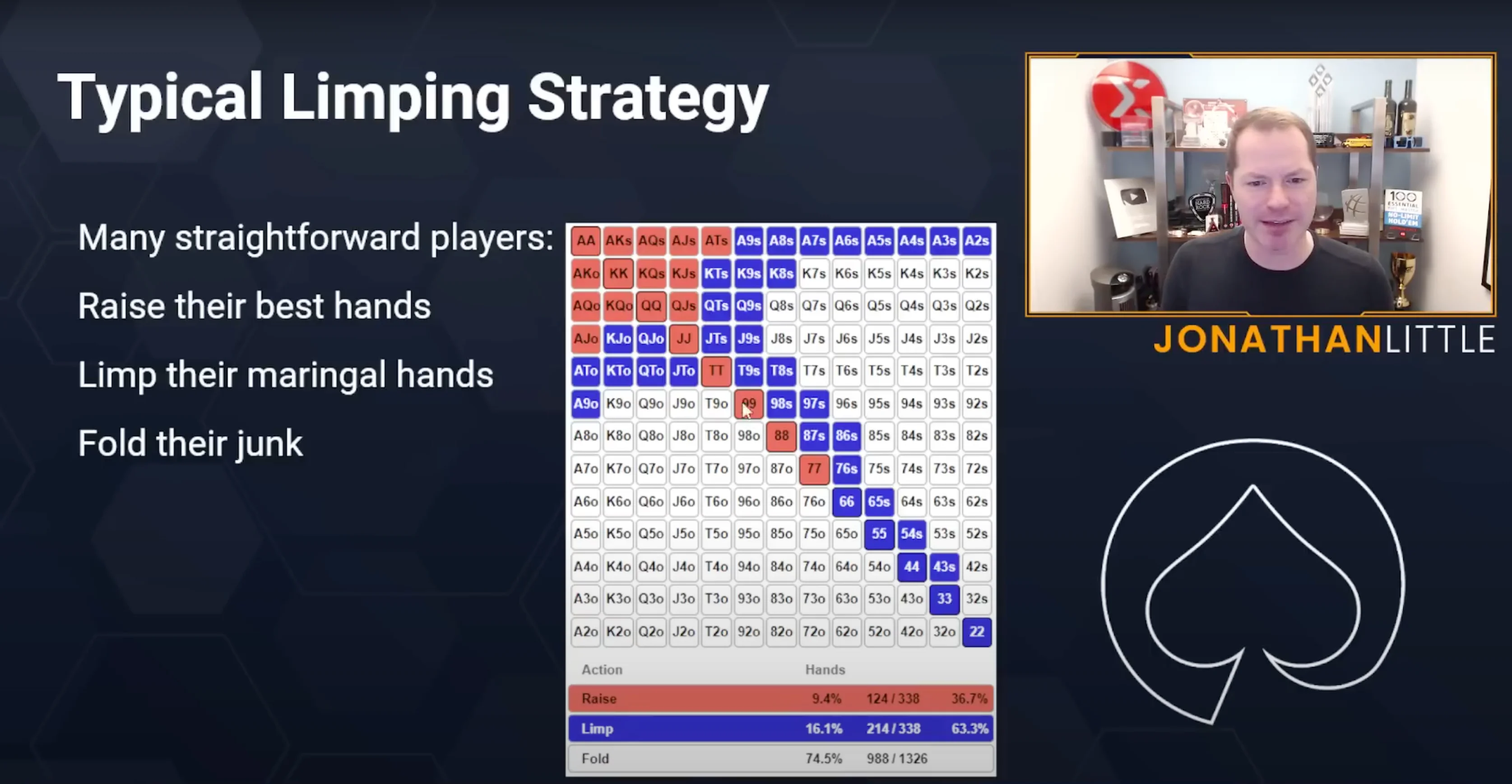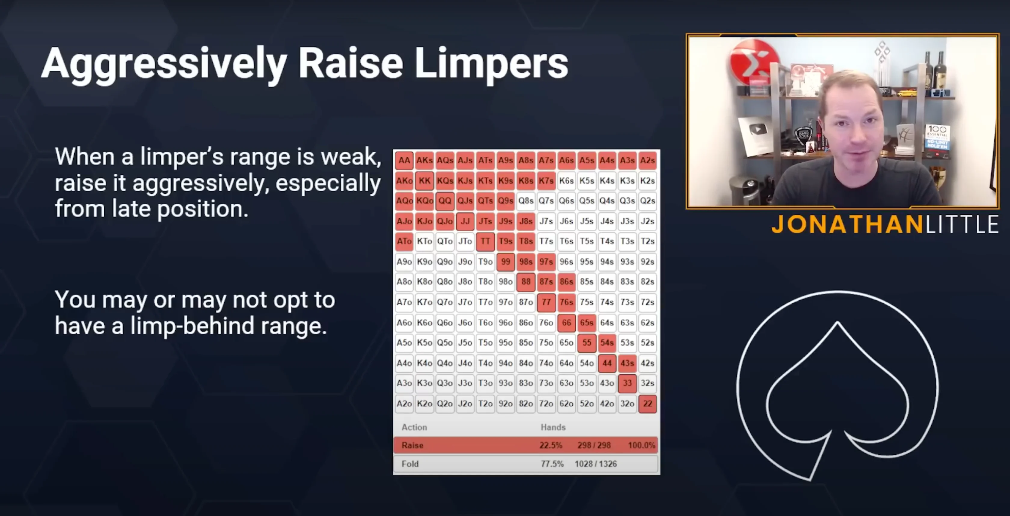 Recognize that some players will limp with far more hands. They’ll limp with hands like King-four suited, Ten-six suited, Seven-four suited, Nine-eight offsuit, Ace-eight-six offsuit, etc. If they're going to be limping with really junky ranges, then that's going to make the advice here even more applicable.