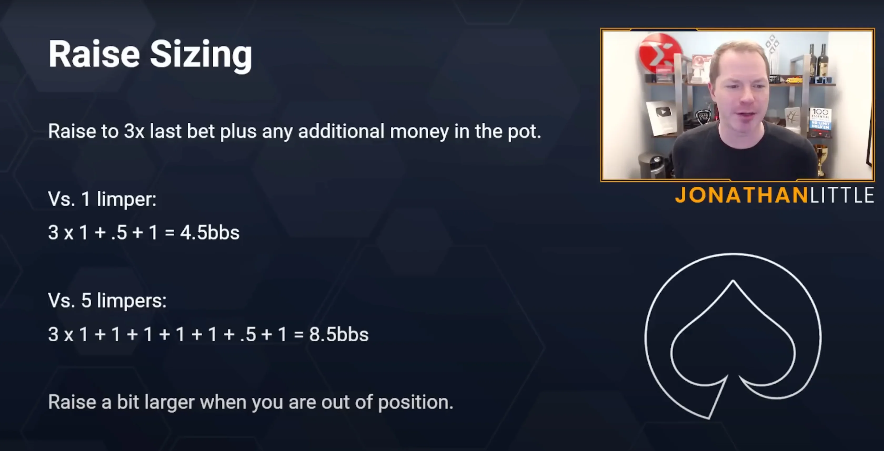 Let's talk about raise sizing. How much should you make it over the limper? Well, you're going to want to make it three times the last bet plus any additional money in the pot. In most scenarios, that is a pot-size raise. So, versus one limper, three times the last bet, which was the opponent's limp, plus the small blind and the big blind. So, 3 times 1 is 3, plus 5 plus 1 is 4.5 big blinds.