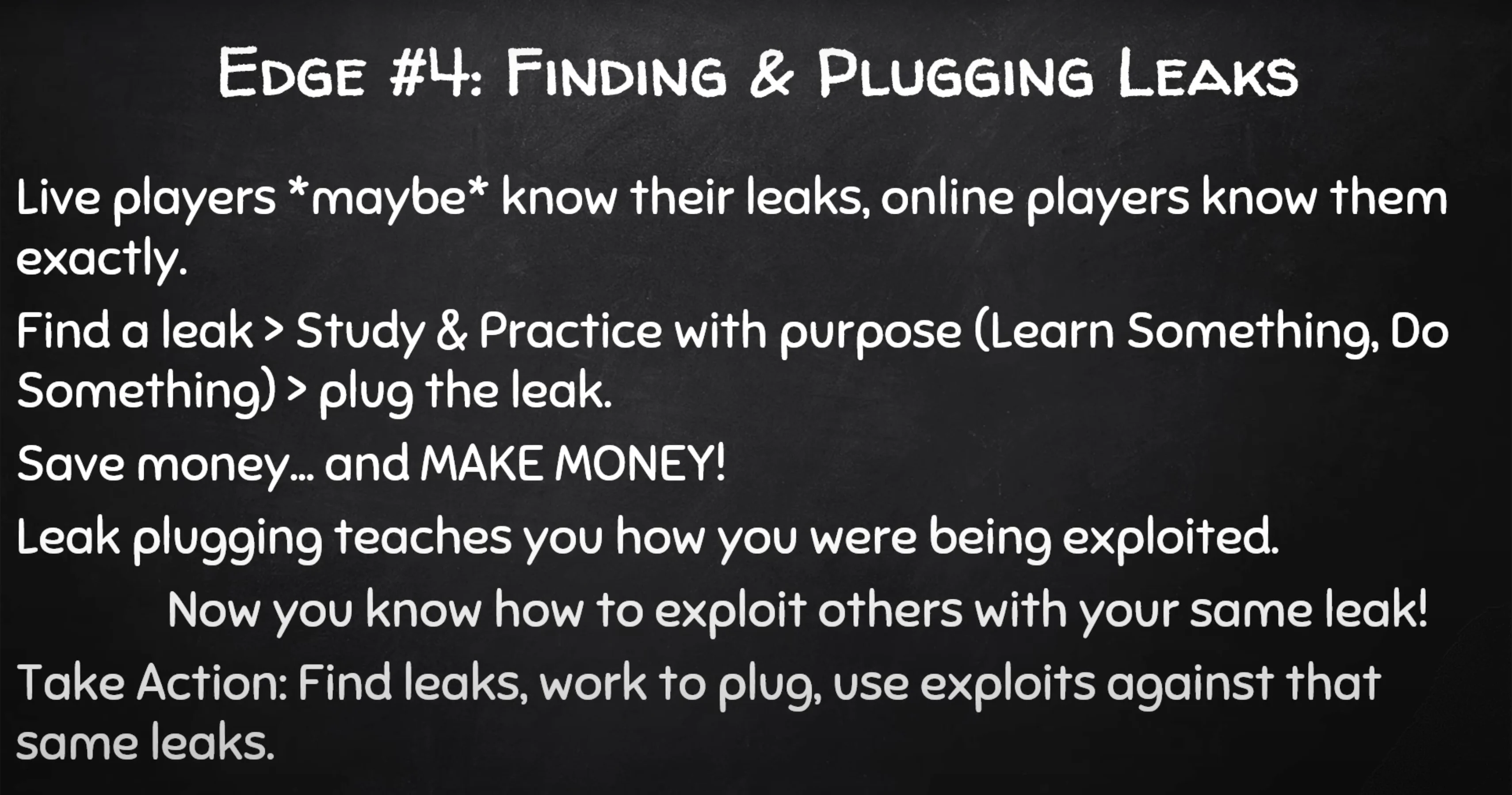 Leak plugging teaches you how you’ve been exploited, and that in turn teaches you how to exploit others. Once you understand your own patterns — what tipped off opponents and how they capitalized — you can spot similar behavior in others and use the same exploitative strategies against them.