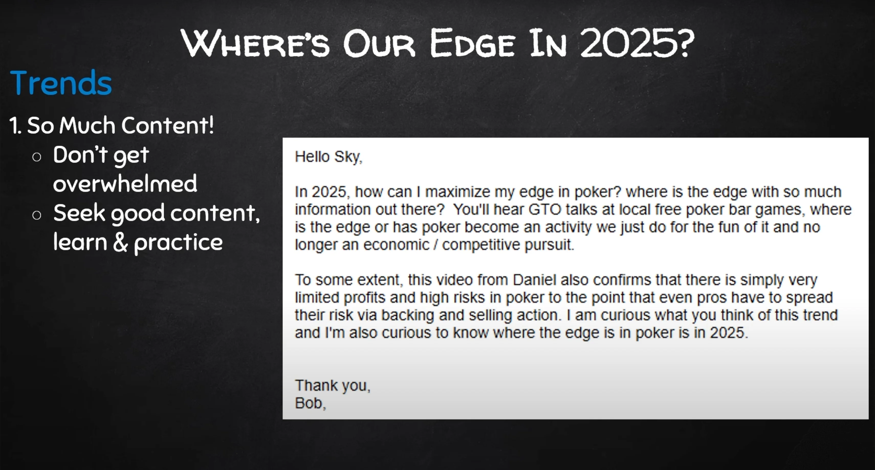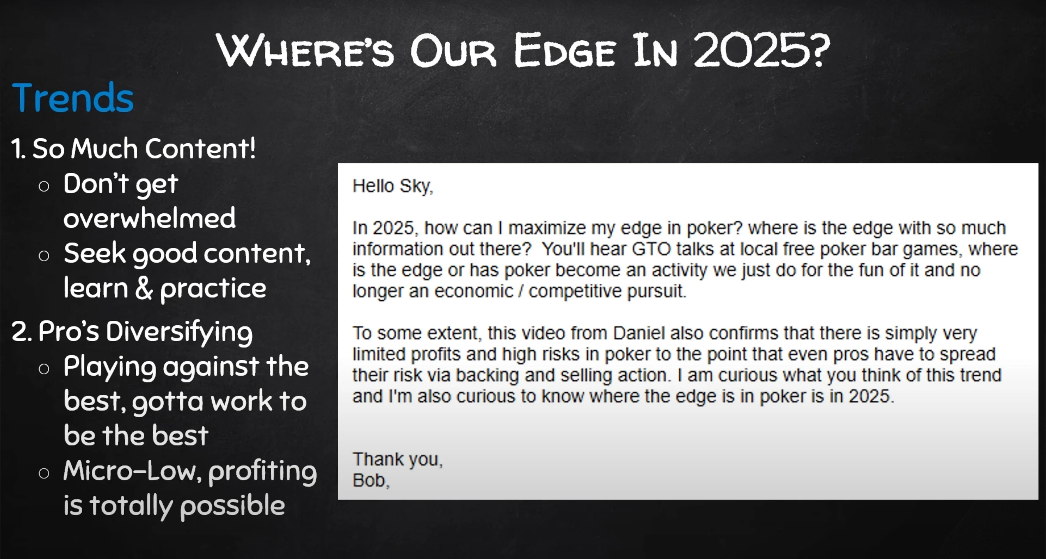 “Hey Sky, in 2025, how can I maximize my edge in poker? With so much information out there — even GTO being discussed at free bar games — where is the edge these days? Has poker become just a fun hobby, or is there still room for real competition and profit? I saw a video from Daniel (no link, unfortunately), and it seemed to confirm that profits are slim and the risks are high. Even pros are selling action and seeking backing. What do you think of this trend? And again — where’s the edge in today’s game?”.