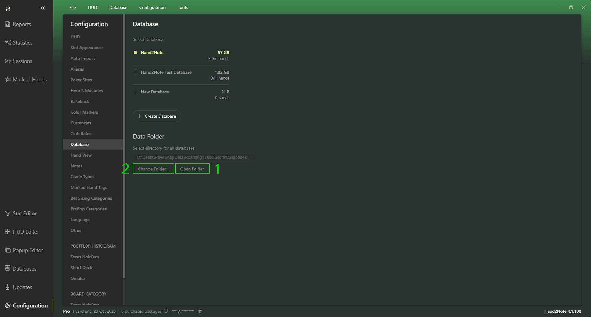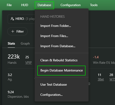 The database is the foundation of all your analytics. It stores the played hands, opponent statistics, and analysis results. Without it, Hand2Note will not be able to show the HUD or build a report.