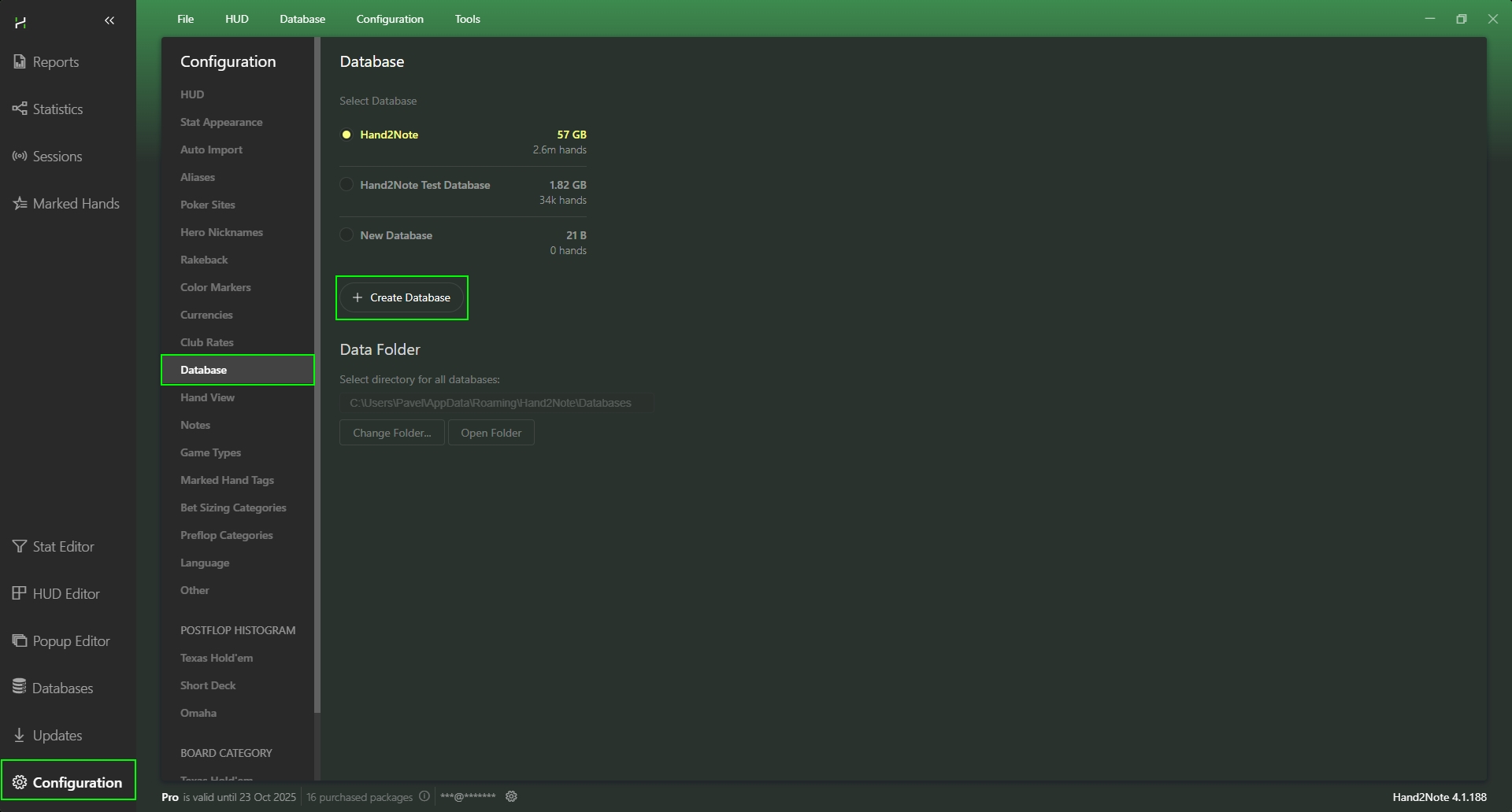 Database management is located in the Settings of Hand2Note → Database. To create a new database, follow these steps: