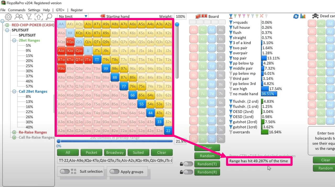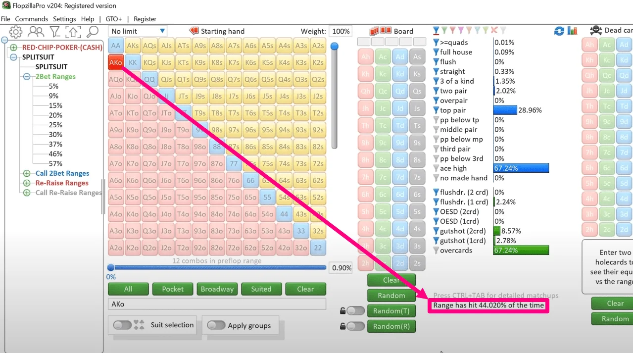But let's move on to how FlopzillaPro helps you understand the hit (and miss) frequencies of different hands and even entire ranges. For example, let's see how the strongest unpaired starting hand (AK) hits the flop.