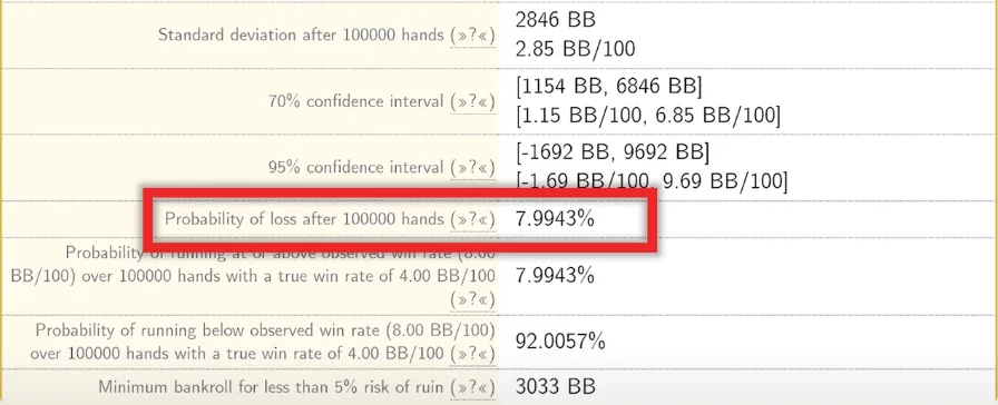 I mean if you look down below at the overall numbers probability of loss even for someone winning 4 bb/100, there is still 8% over a 100,000 hands.