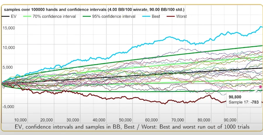 Even when you are winning with a +4 EVbb/100 winrate, you still have an 8% chance to lose your bankroll with such a variance