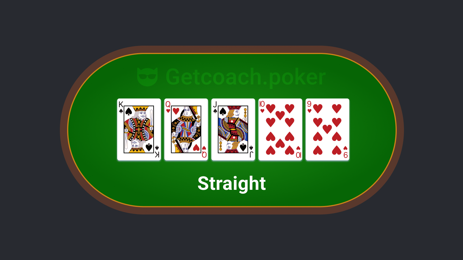 Straight represents a set of five cards in sequence by rank. The suit of the cards must be different - if suit is the same, then a player has a Straight Flush (which will be discussed later).