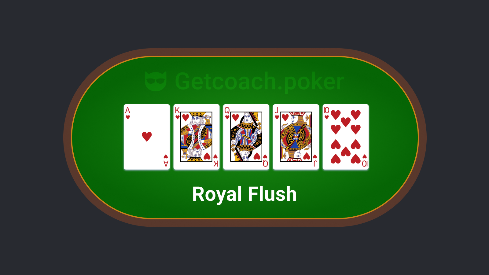 Royal Flush is the highest possible variation of a straight flush. It is formed by 5 cards of the same suit in order from Ten to Ace : T-J-Q-K-A. There are four variations of royal flush: hearts, clubs, diamonds, spades. And it is the best possible hand in NLHE, which is unbeatable. They look like this:
