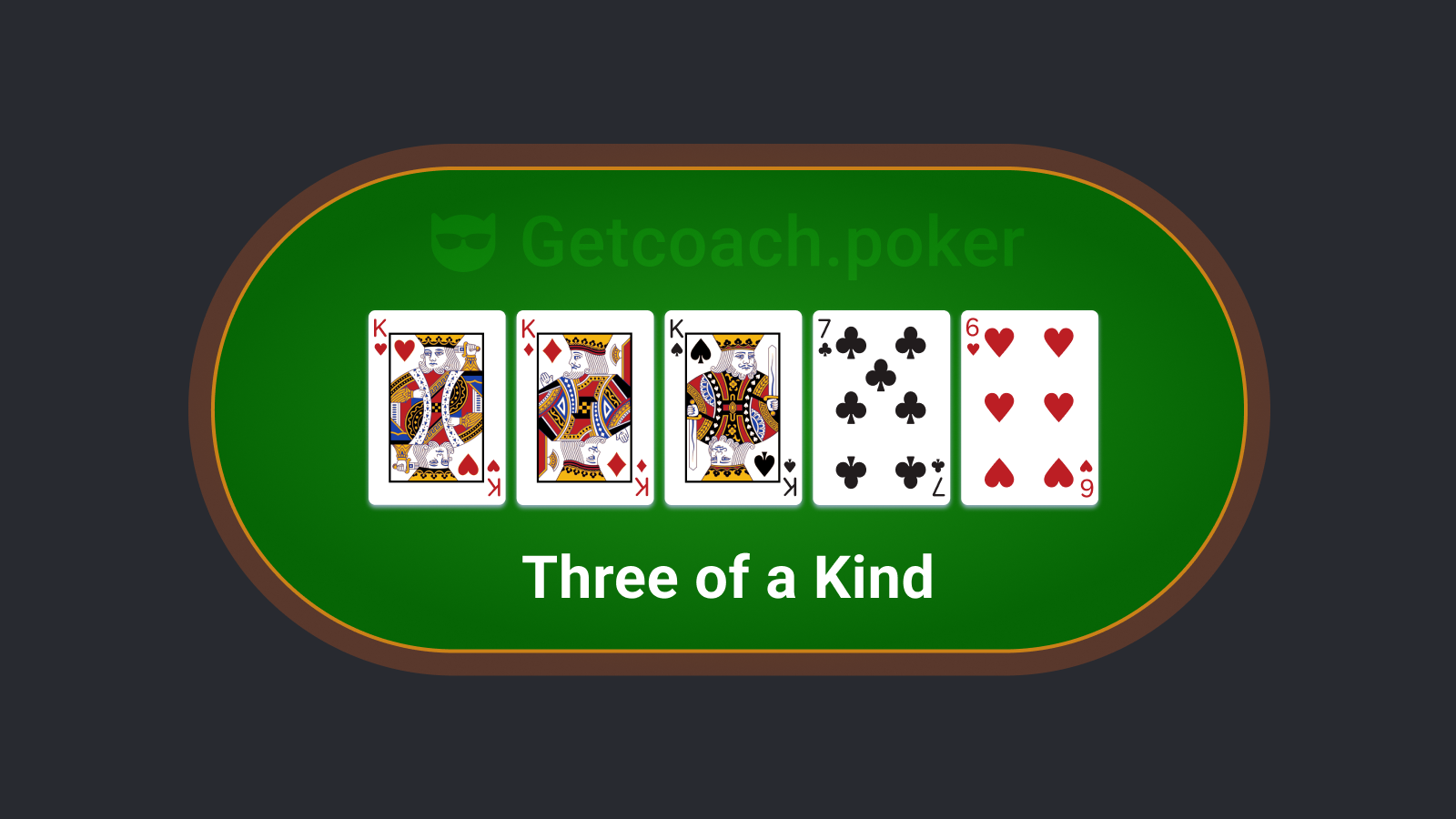 Three of a kind is 3 cards of the same rank: for example, three kings or three fours. Three of a kind is quite rare and is therefore considered a strong hand, as it beats weaker hands, such as a pair or two pairs, which are formed much more often.
