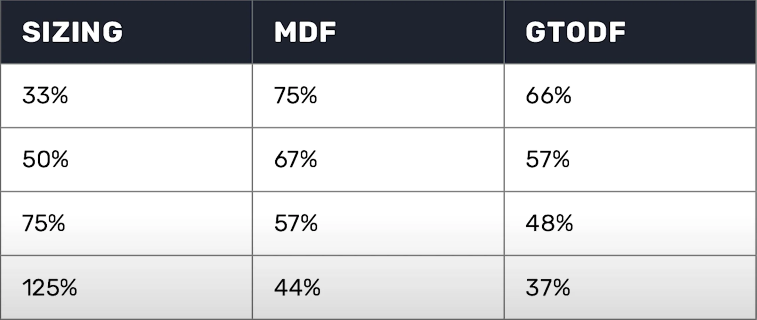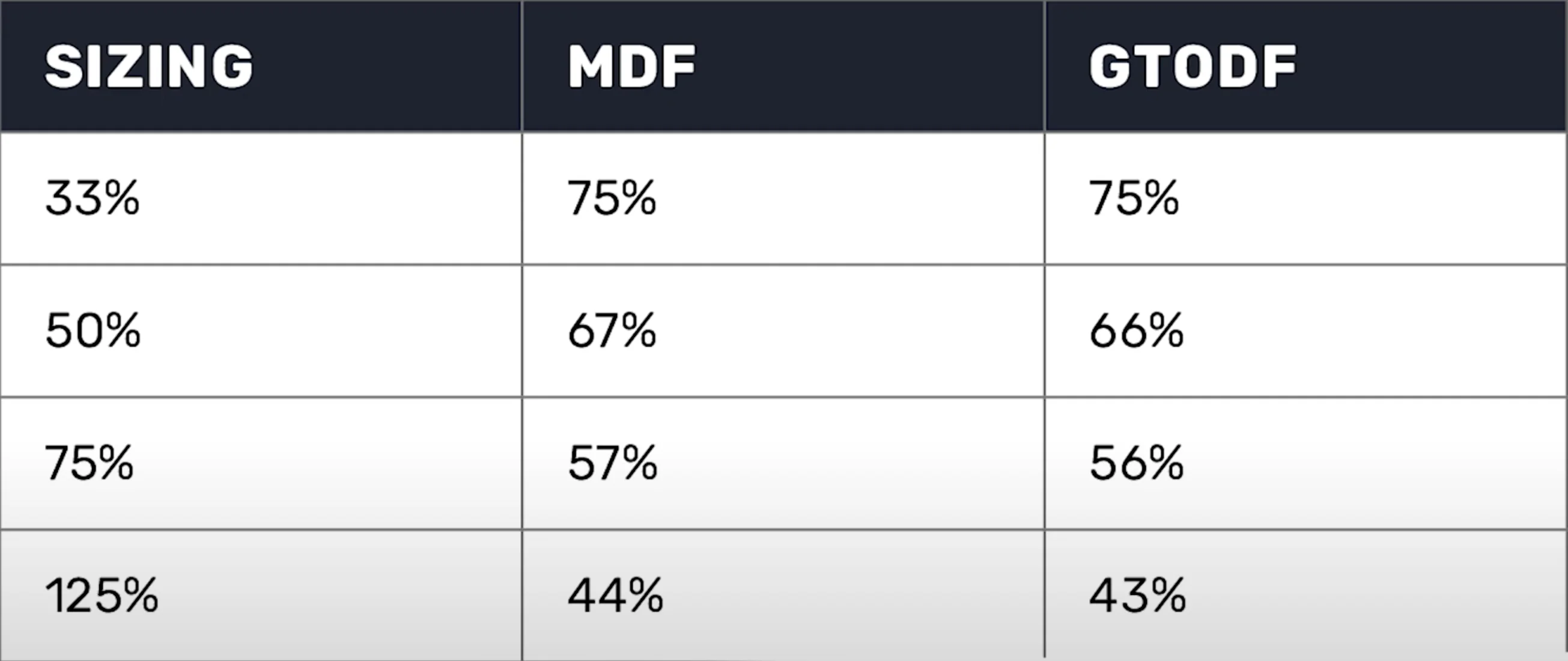 Against a 33% sizing, MDF and GTO defense frequencies, the exact same. Even at the overbet, 44% for MDF, 43% for GTO defense frequency, those are extremely similar and we notice this for all sizes within the spectrum.
