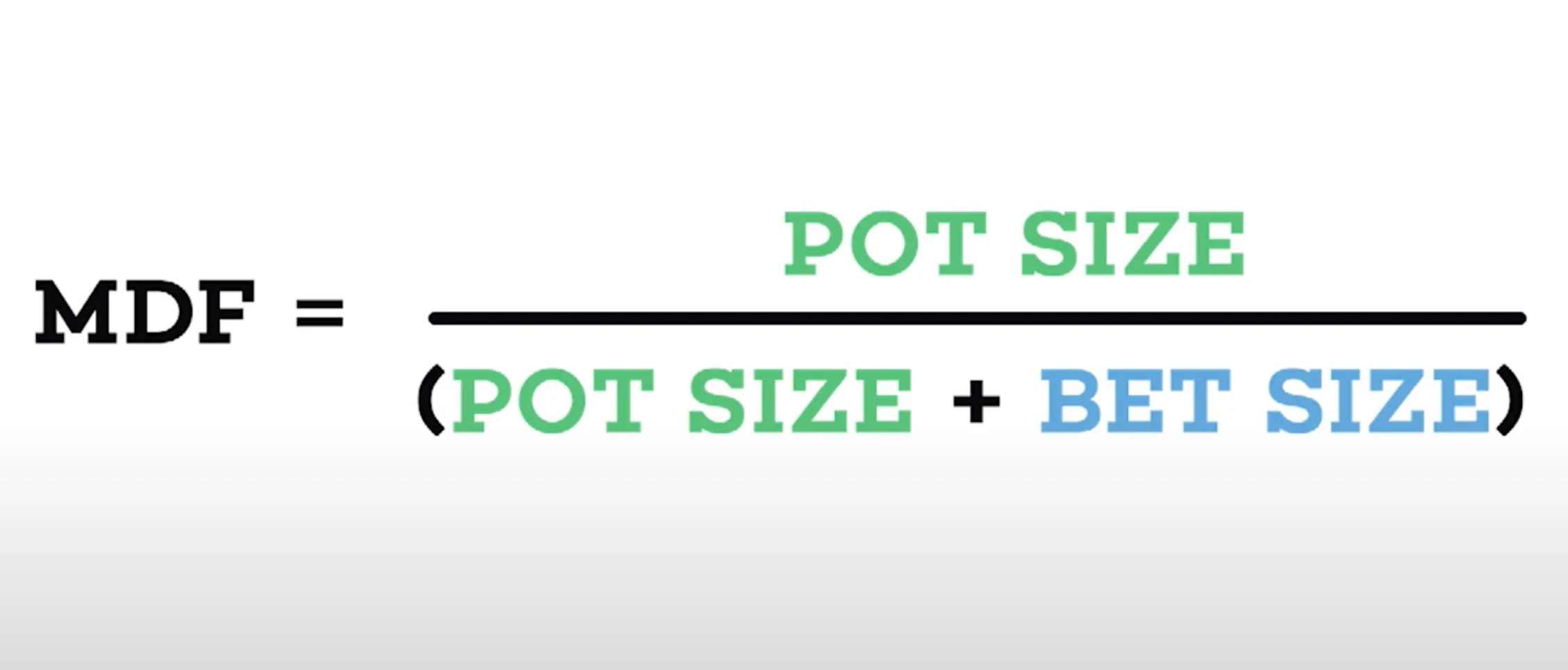 Many players are convinced that MDF (minimum defense frequency) is specifically a GTO concept. And while there are overlaps, and even sometimes exact similarities in output, MDF is NOT truly GTO. The formula for MDF is simply pot size divided by pot size plus bet size - it’s easy: