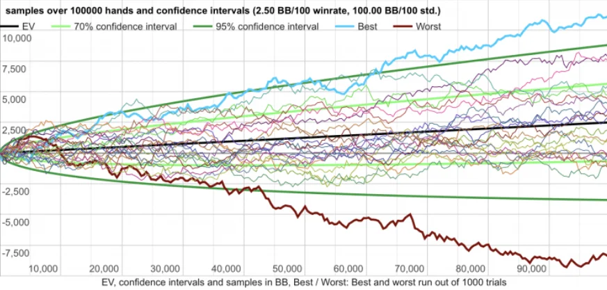 Normally, if you can win 2.5bb/100, you'd expect to get 2,500 bb over 100,000 hands. However, as shown by the calculations, there can be significant deviations in results due to poker variance.