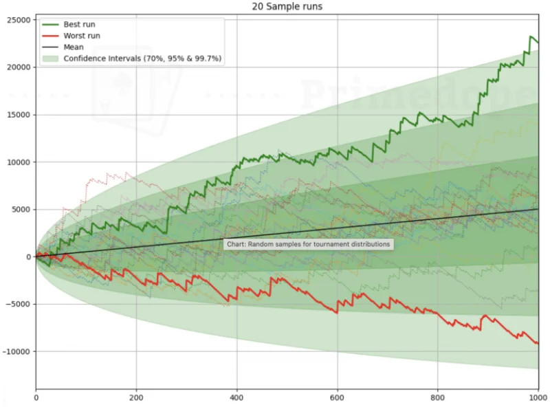 Out of 20 outcomes, in the worst-case scenario, you could lose nearly $10,000, while in the best-case scenario, you could win nearly $25,000. Therefore, even a player who could normally win $5,000 might lose $10,000 in some instances. This could potentially lead to a loss of self-confidence, but as shown by the calculations, this is a realistic outcome that can happen 1 in 20 times.