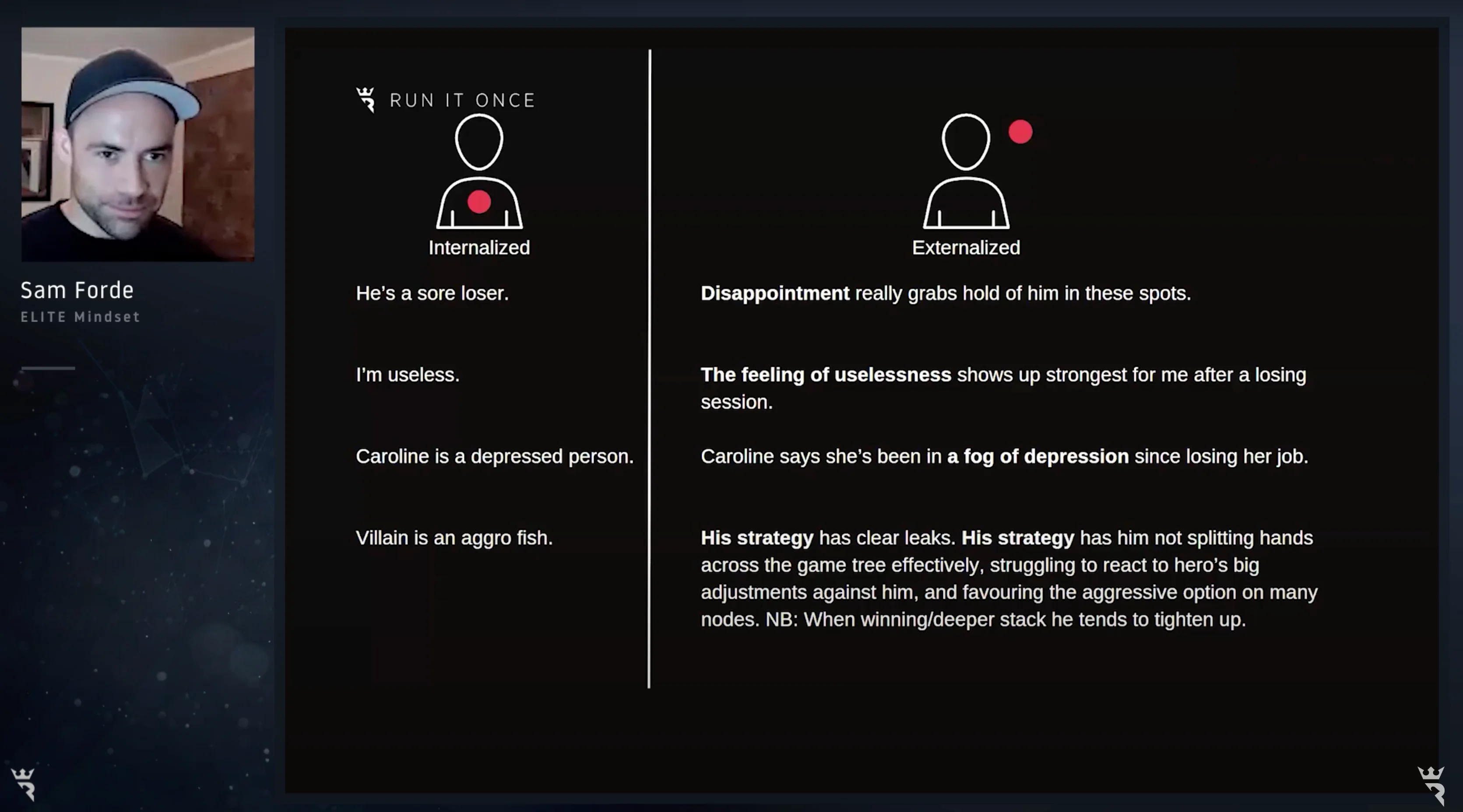 "All right, Caroline is a depressed person" / "Caroline says she's been in a fog of depression since losing her job". And how about this one? Villain is an aggro fish. Well, his strategy has clear leaks. His strategy has him not splitting hands across the game tree effectively, struggling to react to Hero's big adjustments against him, and favoring the aggressive option on many nodes. And hey, in addition, when winning or deeper stacked, he tends to tighten up.