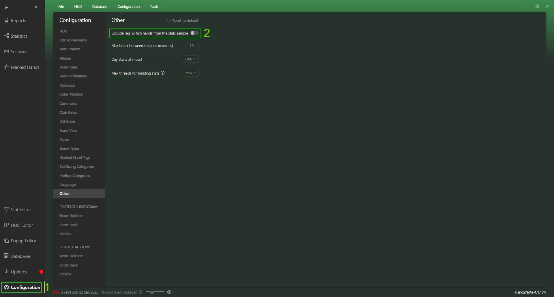 Hand2Note has a setting that automatically excludes Reg-vs-Fish hands from the regulars' statistics (so that their data is cleaner). In Configuration → Other, activate the Exclude reg-vs-fish hands from the stats sample option. Then Hand2Note will ignore all hands in which at least one player with a fish tag remains at the table. This provides more accurate data on opponents when there are no Chips left at the table.
