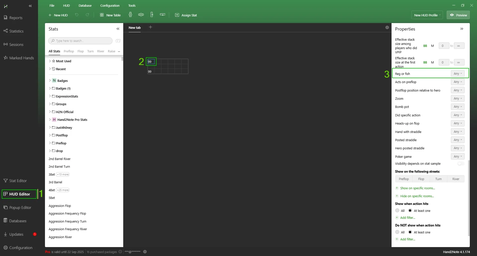 Hand2Note allows you to display different HUDs and statuses for regs and fish. In the HUD Editor, configure the panel so that its blocks are displayed only for regs or only for fish. To do this, set the condition Reg or Fish = Reg (or = Fish) in the properties of panels or cells. For example, you can create one HUD panel that is activated against regs, and another against fish. This allows you to show different stats for different types of players.: