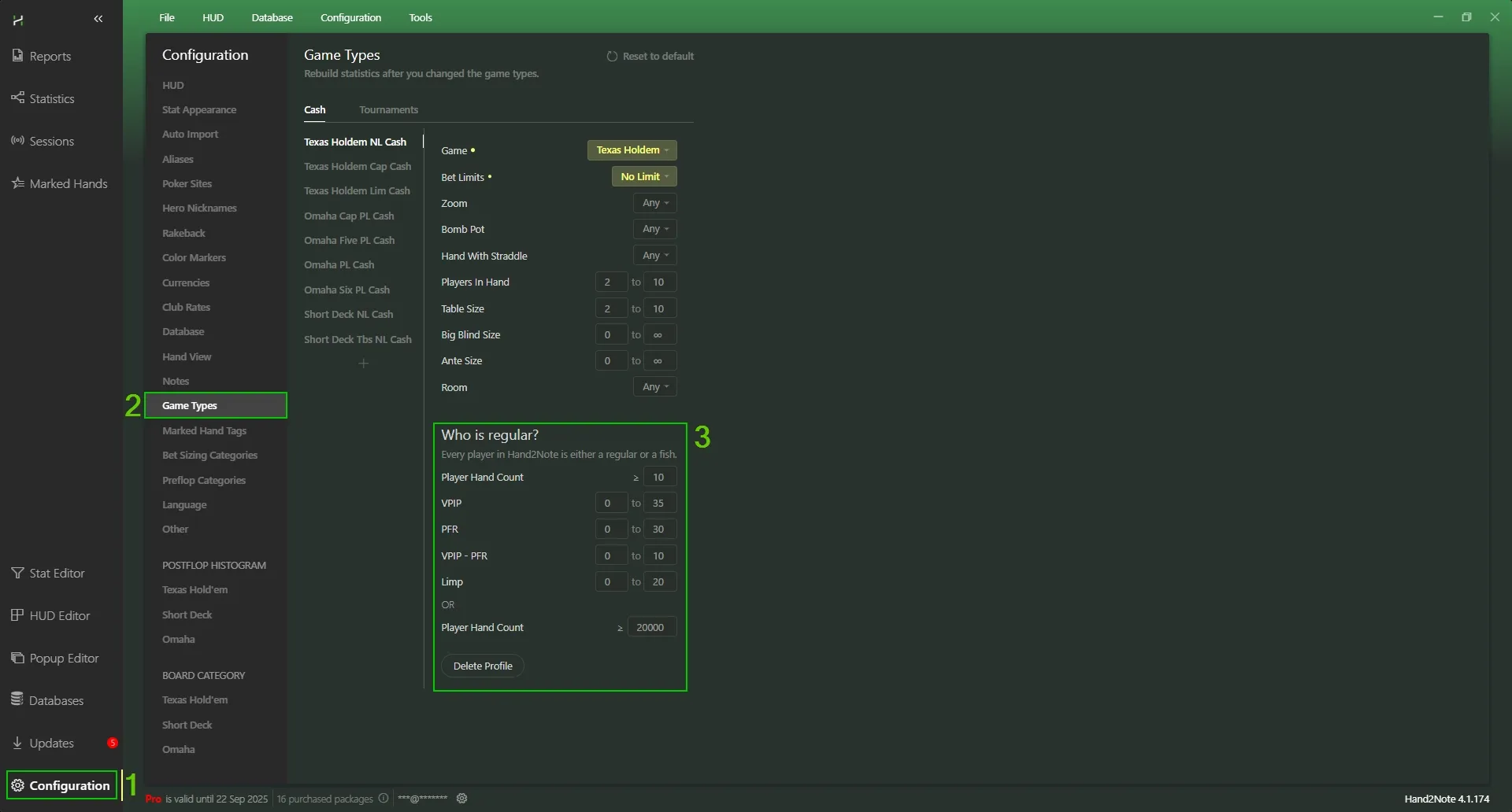 Open Configuration → Game Types and select the appropriate game type (for example, 6-max cache). In the "Who is regular" tab, set the conditions under which Hand2Note will consider the player to be a regular. By default, Hand2Note offers simple criteria: number of hands ≥10, VPIP ≤35%, PFR ≤30%, VPIP-PFR difference ≤10%, limps ≤20, or just hand volume ≥20,000. A player who does not meet these conditions is considered a fish. Adjust these values to suit your playing style.