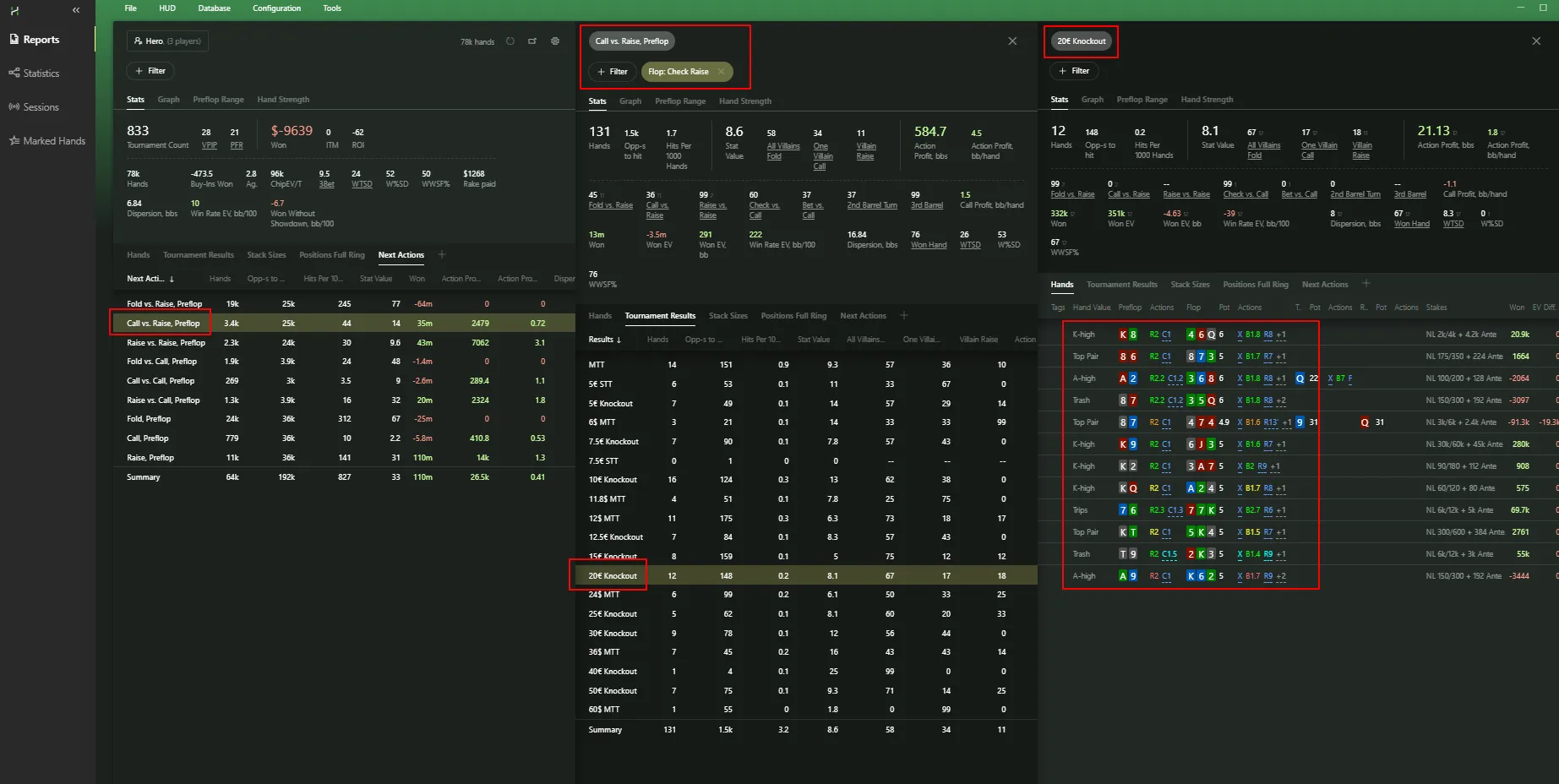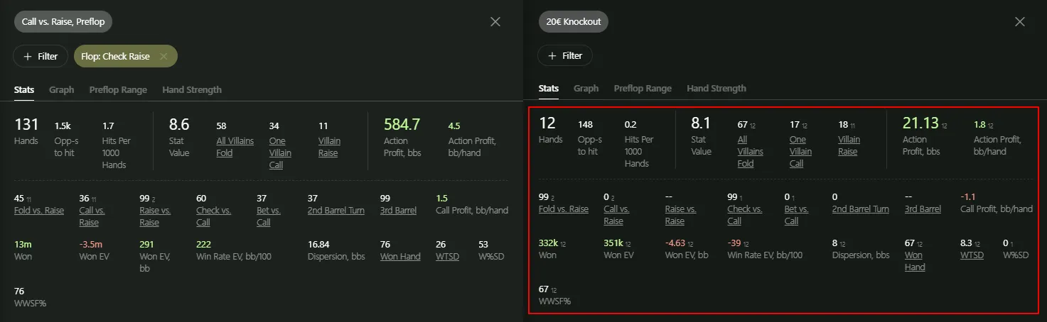 In just 5–6 clicks, we’ve found 12 hands out of 80,000 where Hero cold-called preflop vs an Open Raise and made a Check-Raise on the flop — in €20 knockout tournaments.