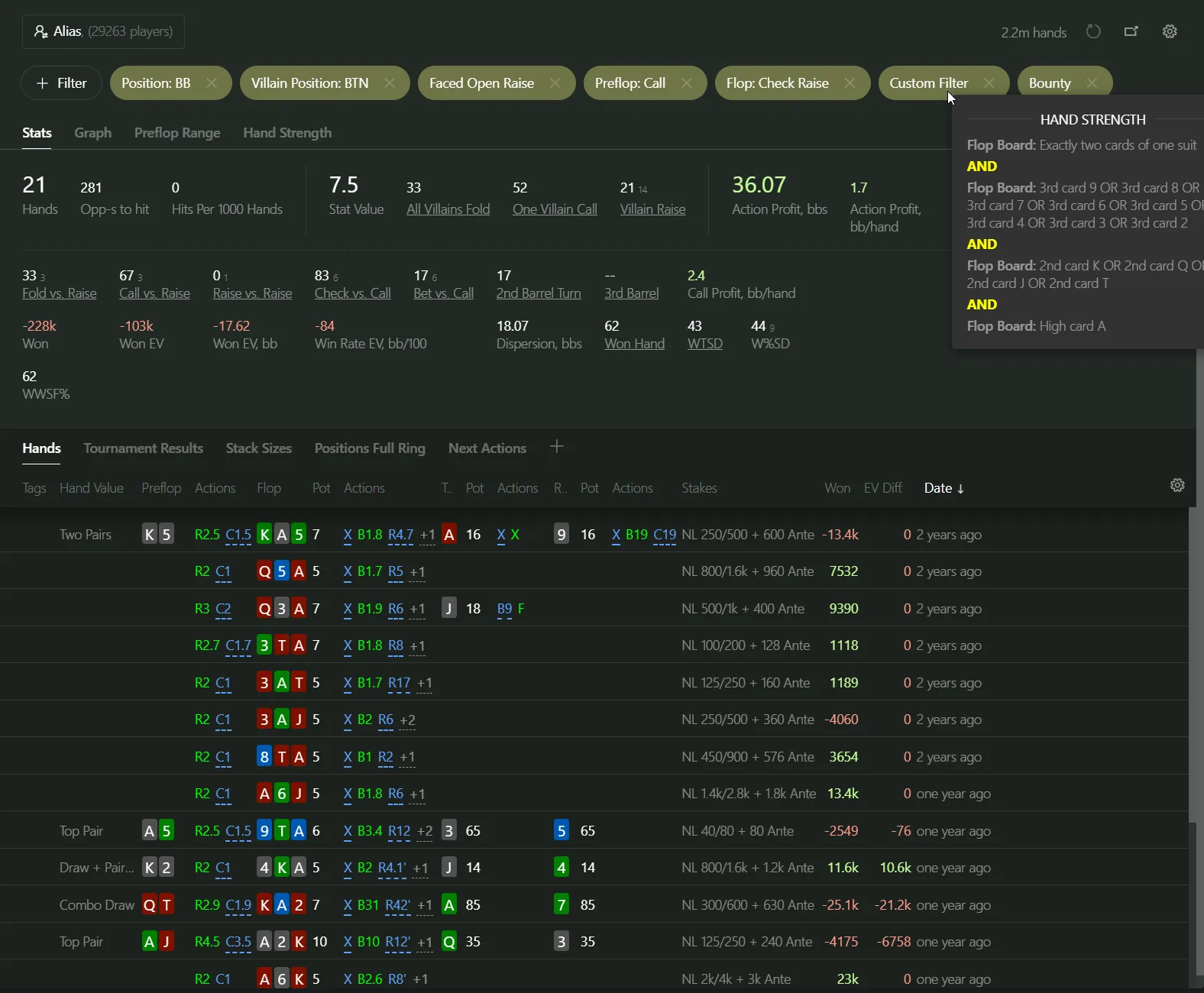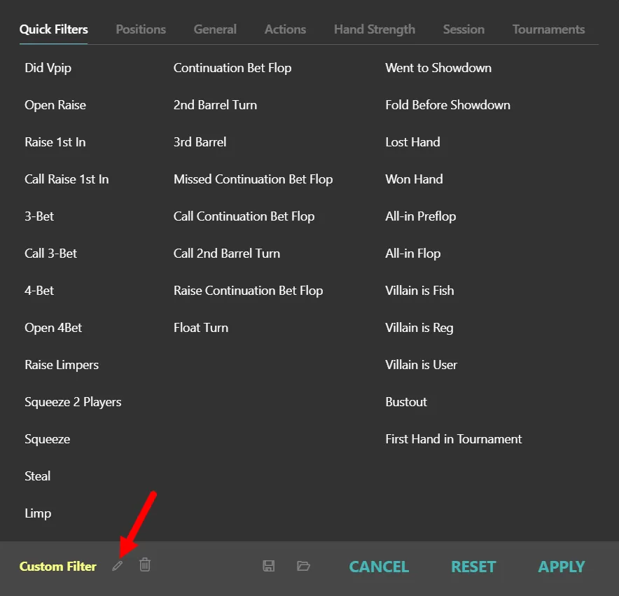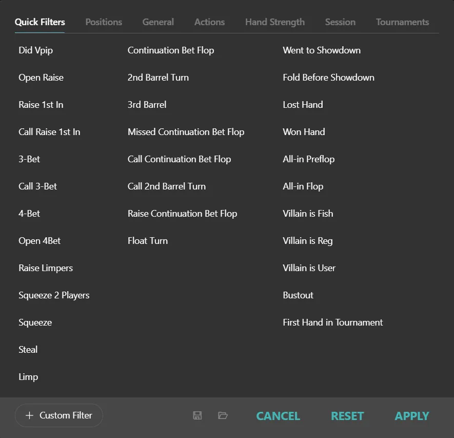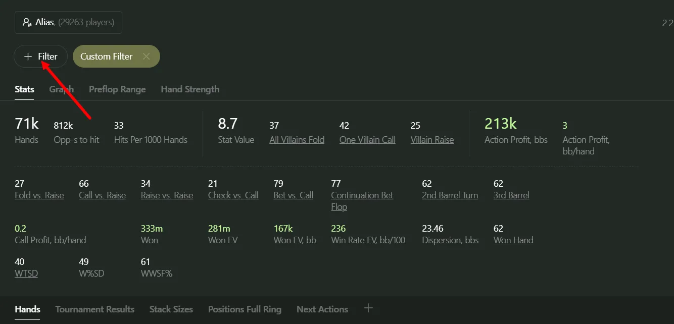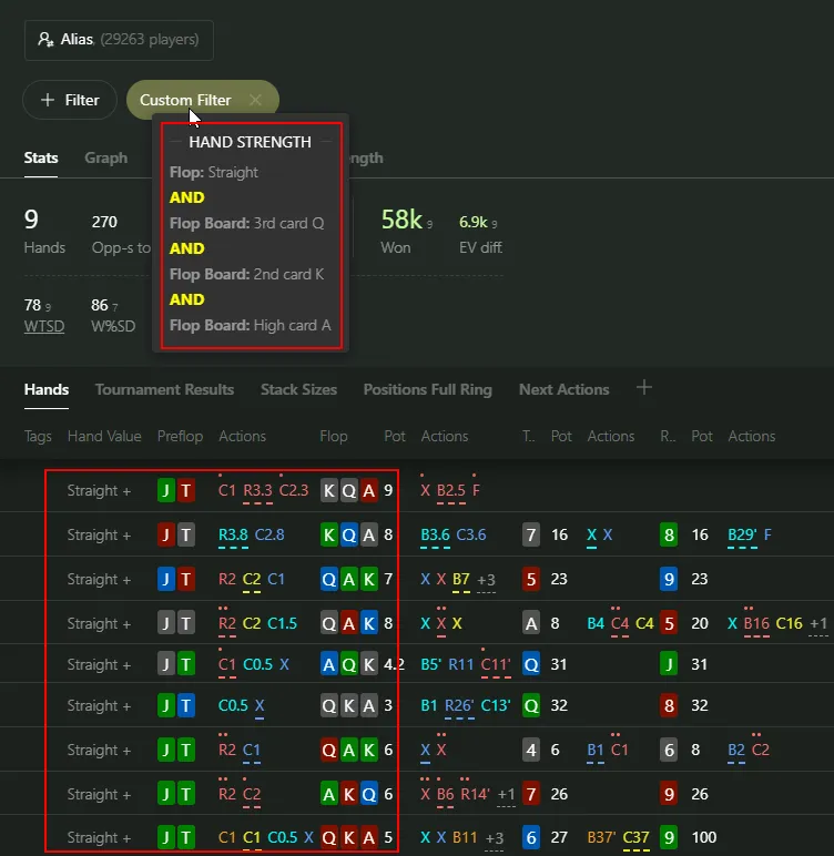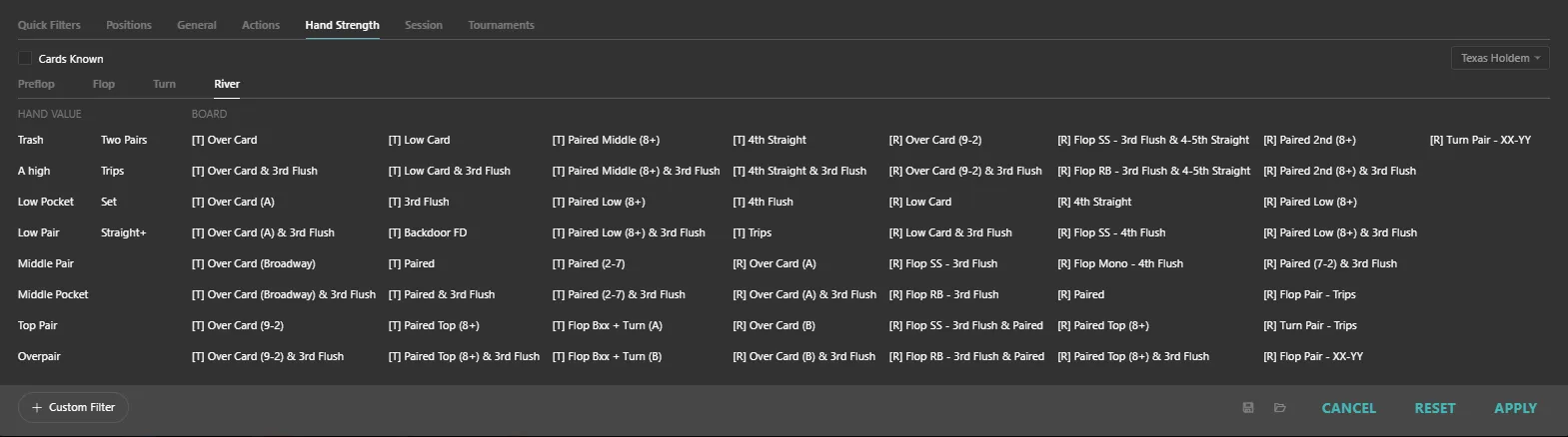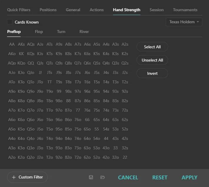 As I mentioned earlier, using this inside the “+ Filter” → “Hand Strength Tab” is clunky.