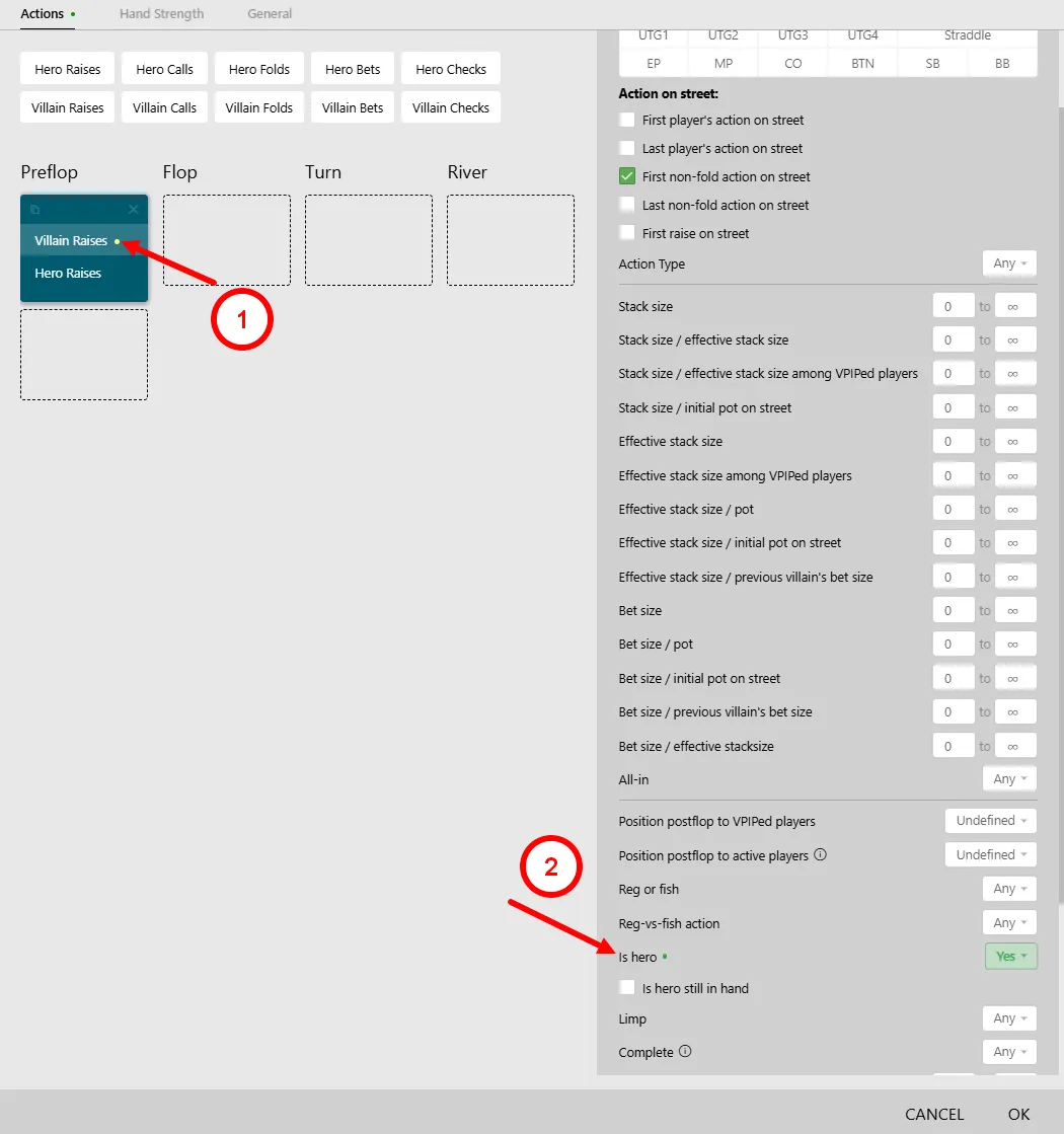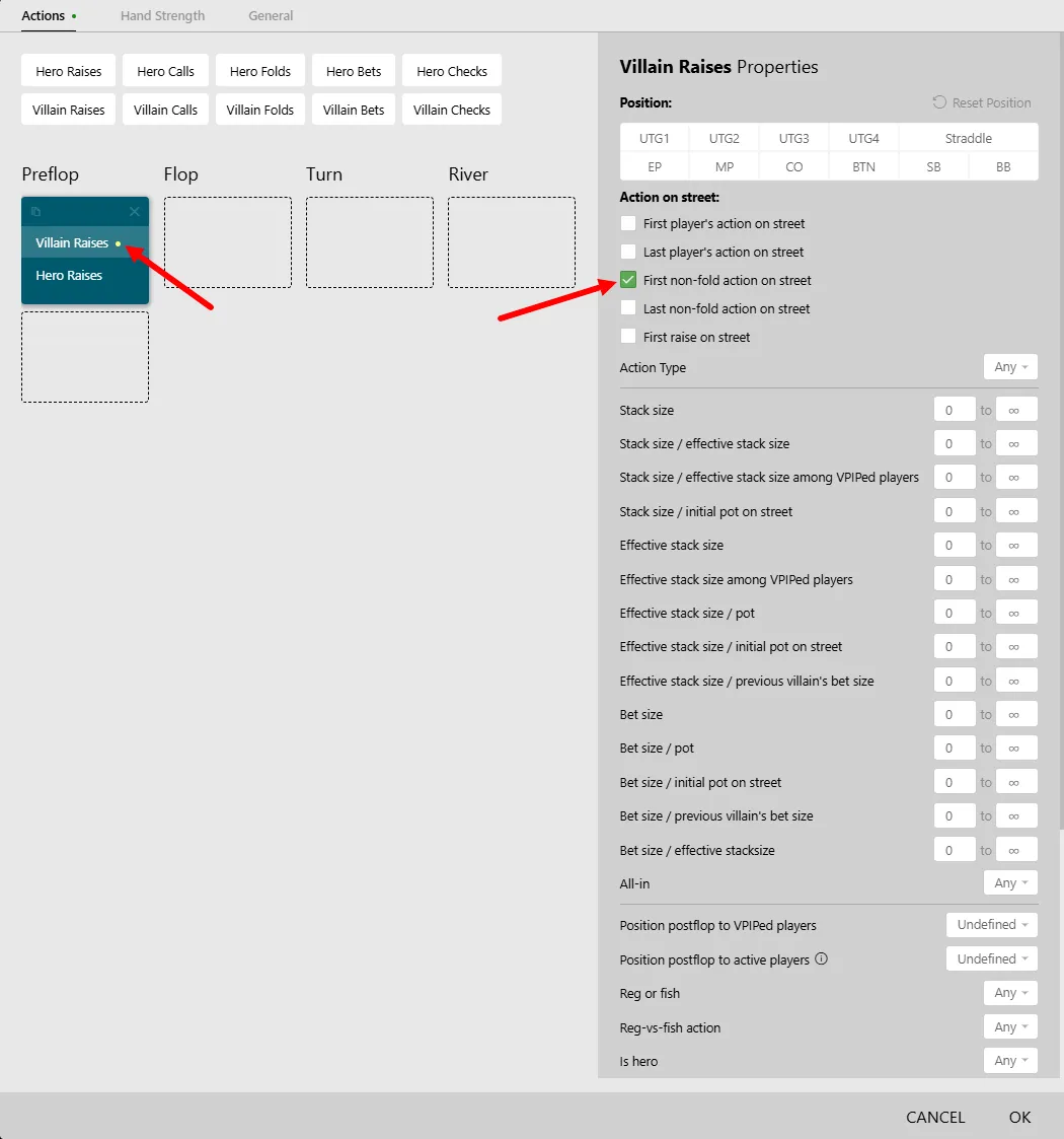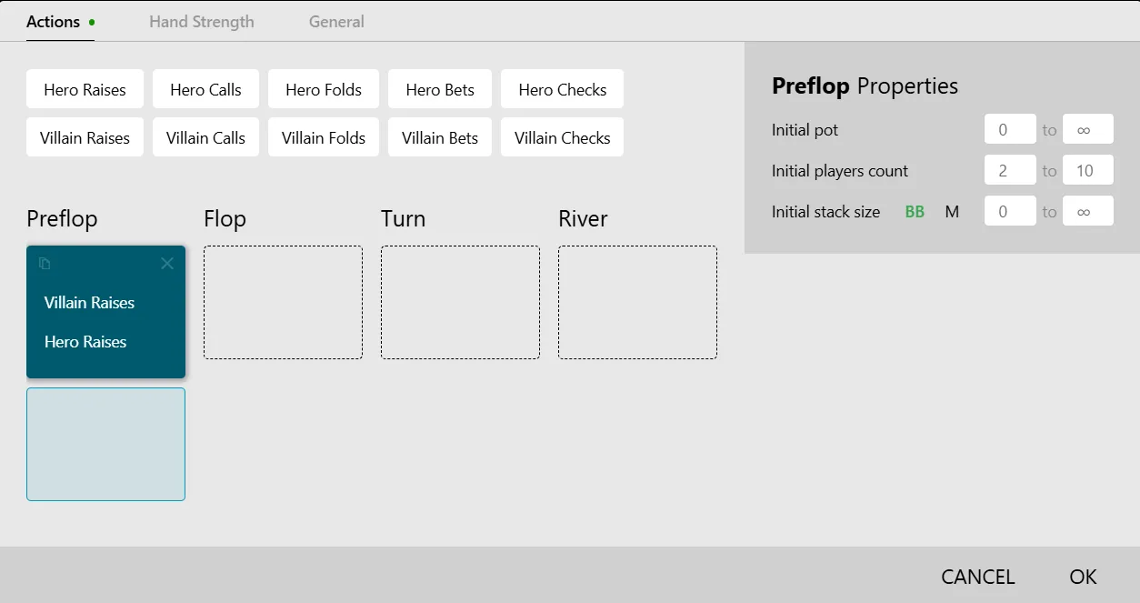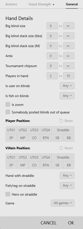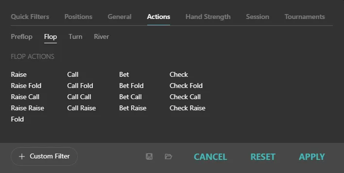 Here we get the classic set of options used to filter not the actions themselves, but rather the conditions of the hand.