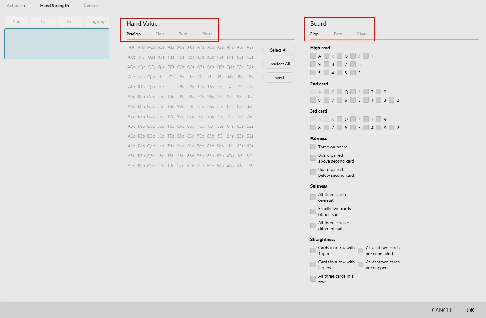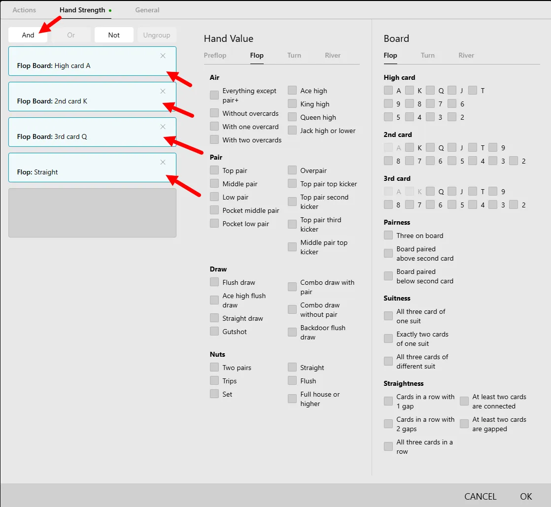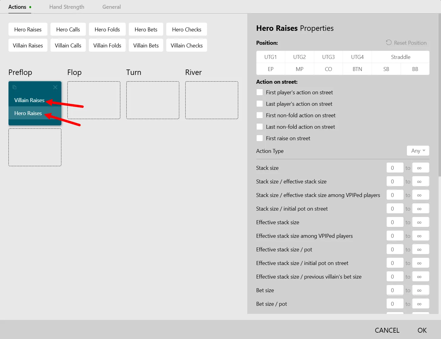 Here we get the classic set of options used to filter not the actions themselves, but rather the conditions of the hand.