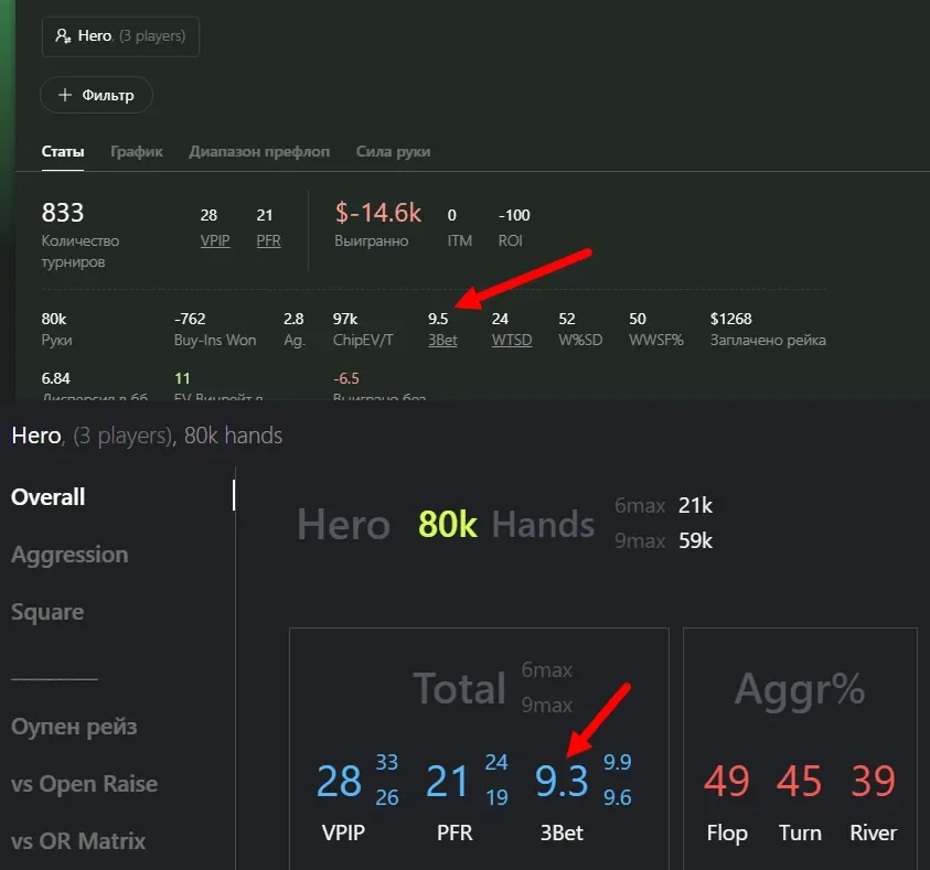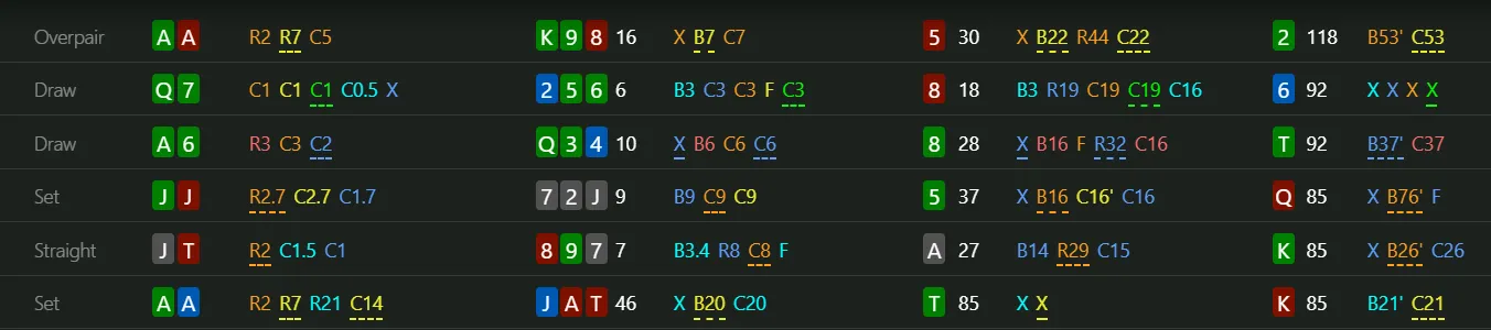 - VPIP / PFR / 3Bet / Aggression Frequency