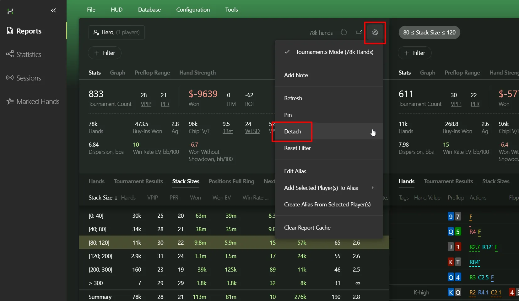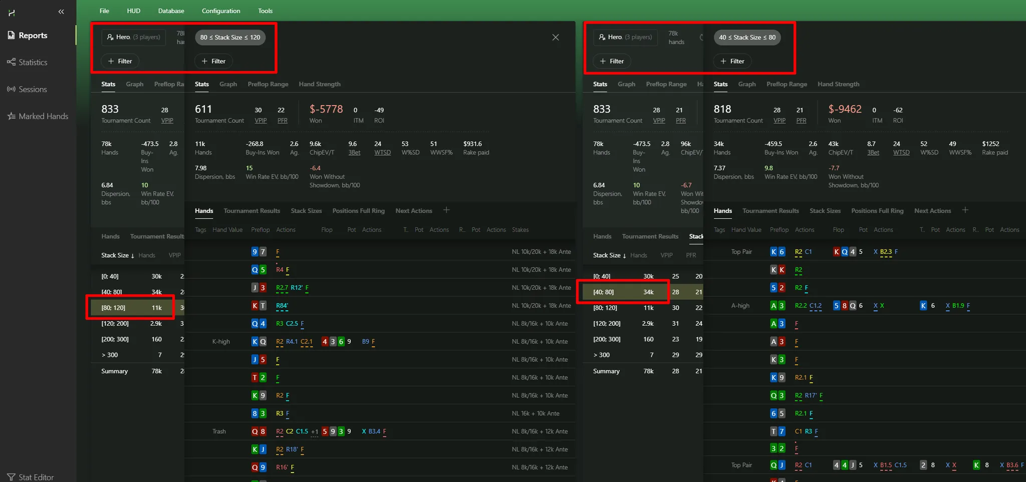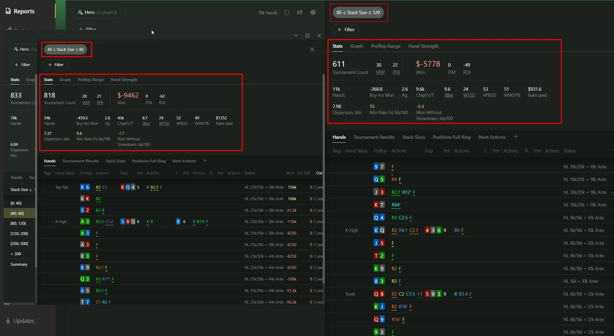 It’s incredibly easy to compare multiple reports side-by-side, without flipping between them in the right panel. Example: let’s compare stack size ranges. Pick 80–120 bb:
