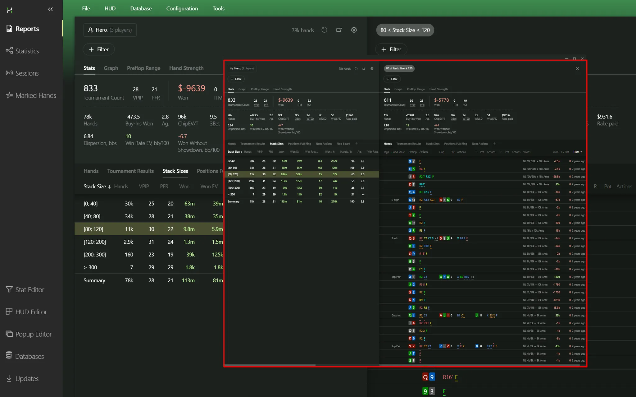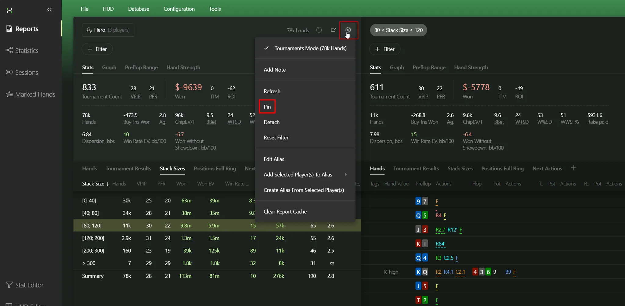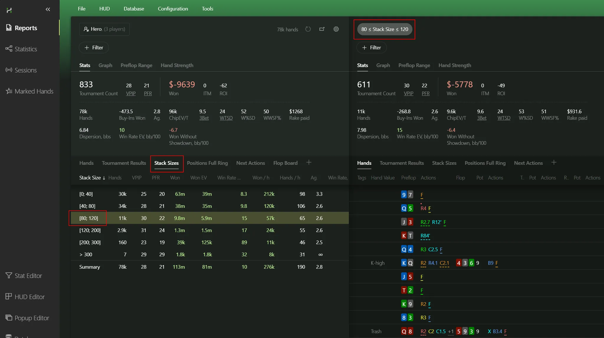 It’s incredibly easy to compare multiple reports side-by-side, without flipping between them in the right panel. Example: let’s compare stack size ranges. Pick 80–120 bb: