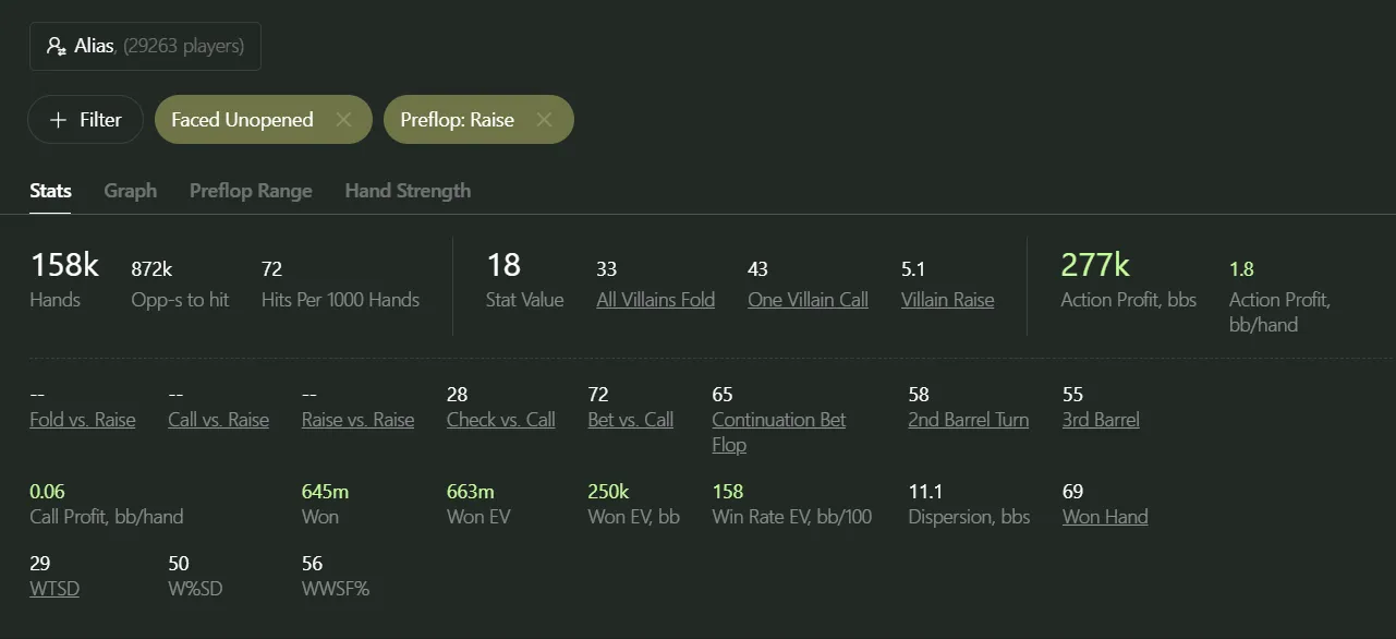 - Open Raise - the player made the first raise preflop, but only when everyone before folded. ISO situations are not included. Raise size can be any.