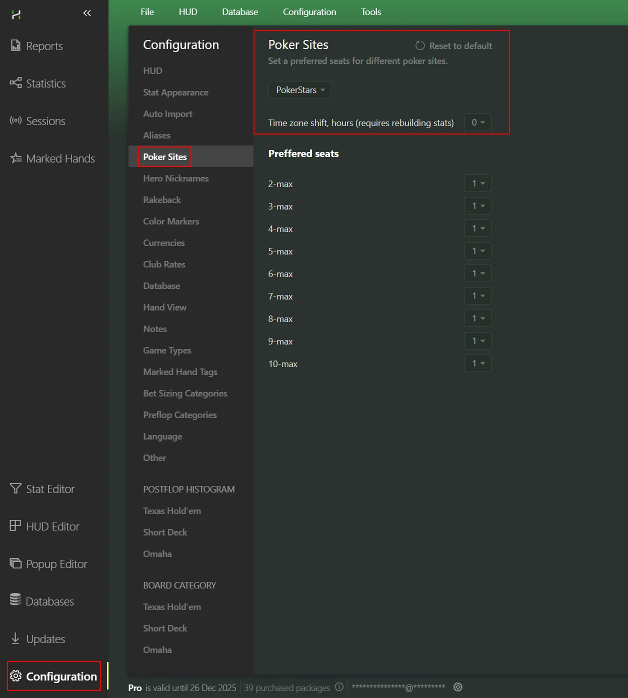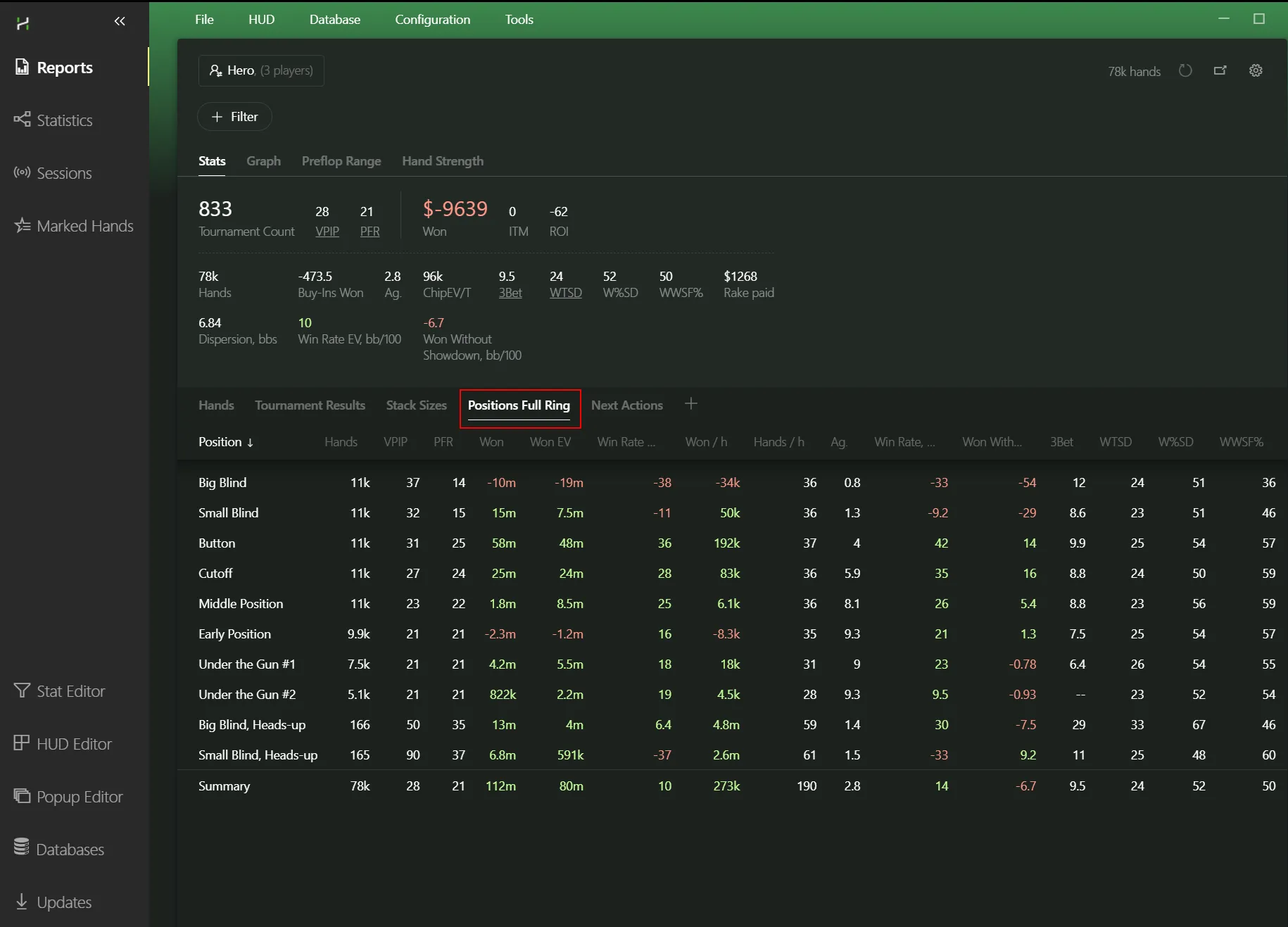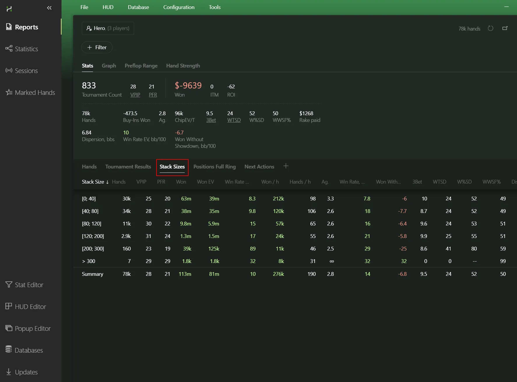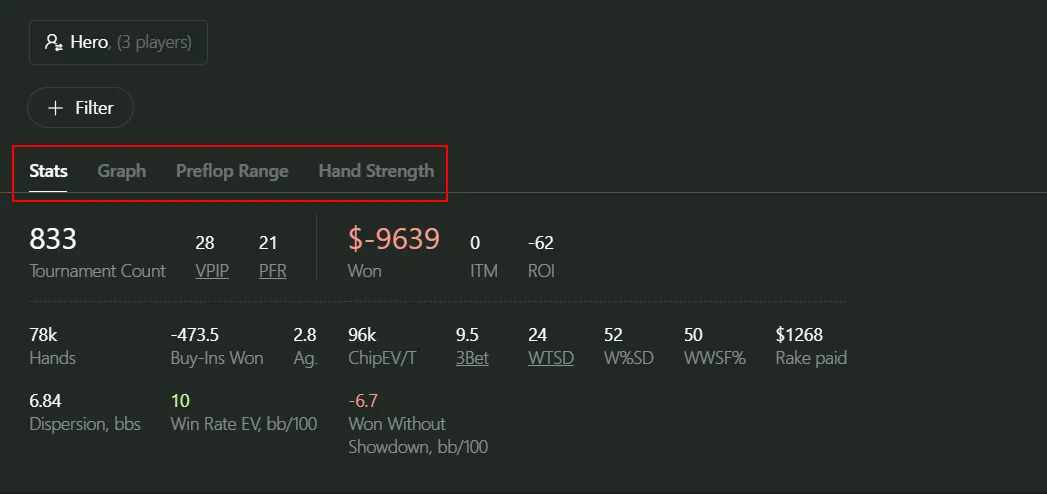 I can already see you’re ready to dive into filtering your database and hunting down opponents’ mistakes and leaks. But I suggest holding off for a bit and reading on — there’s still a lot of useful and interesting stuff ahead. Let’s break down the four tabs that appear under your nickname and filters.