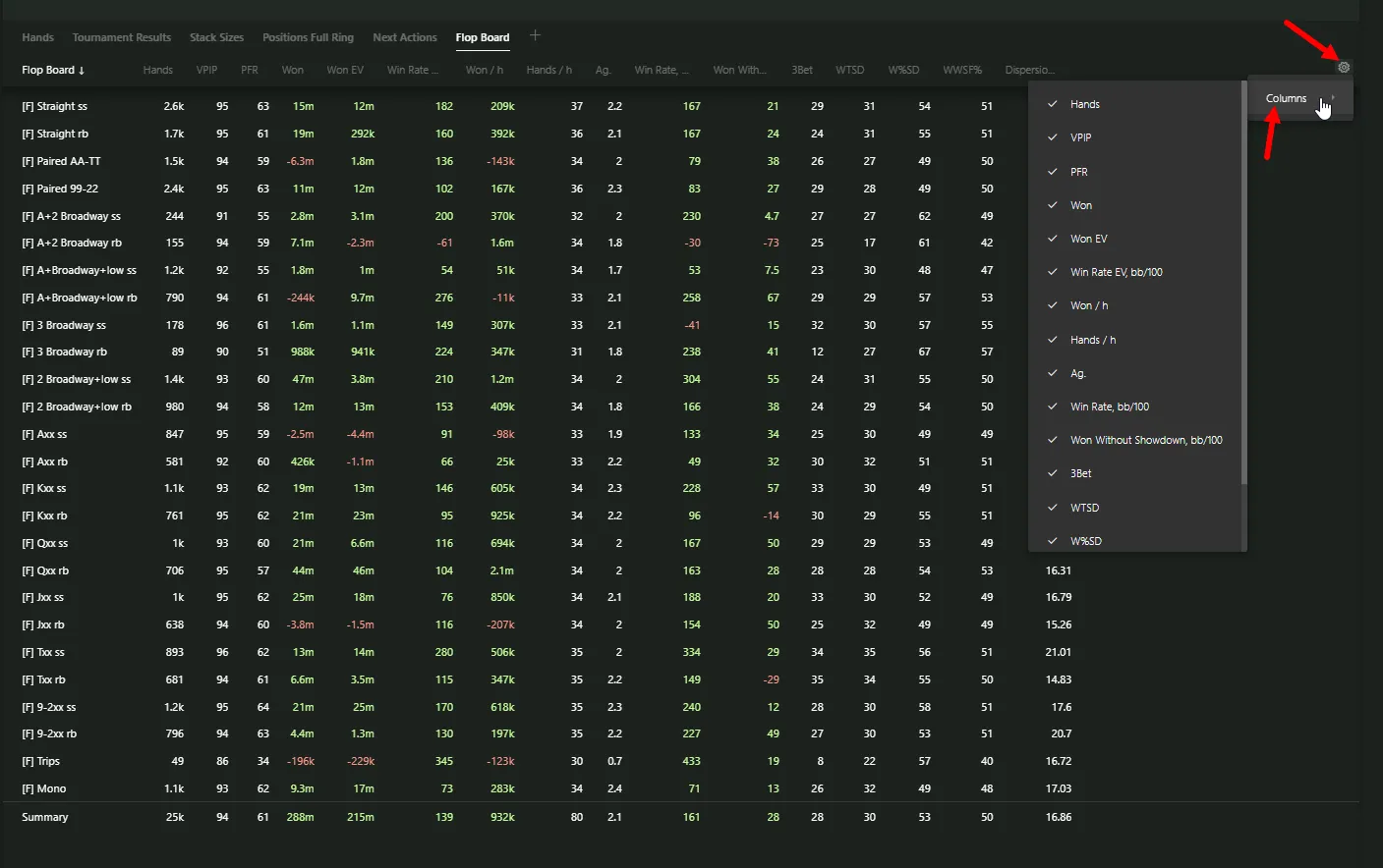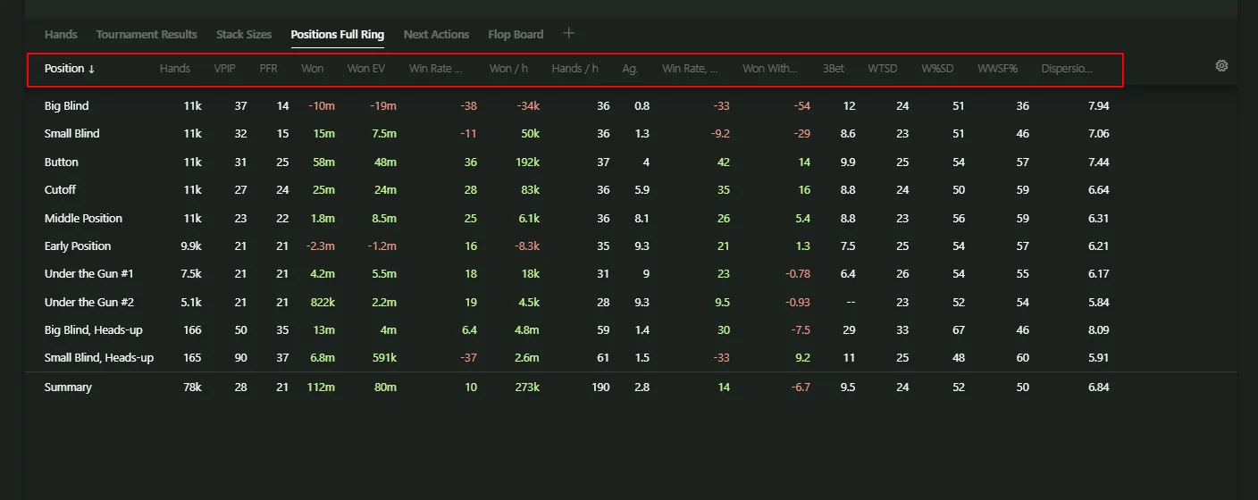 From basic things like the number of players at the start of the hand to more advanced ones like “Win/Loss Amount (bbs)”.