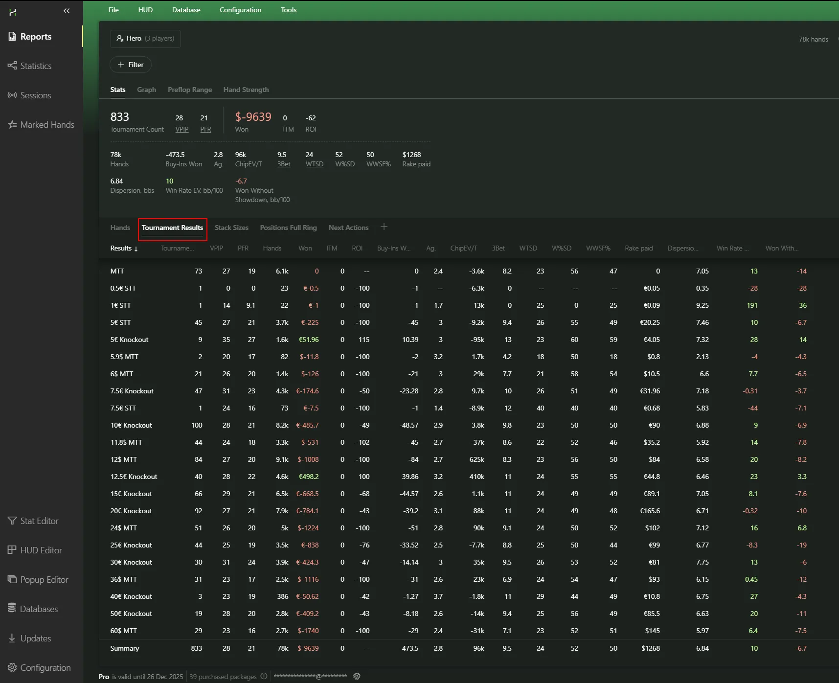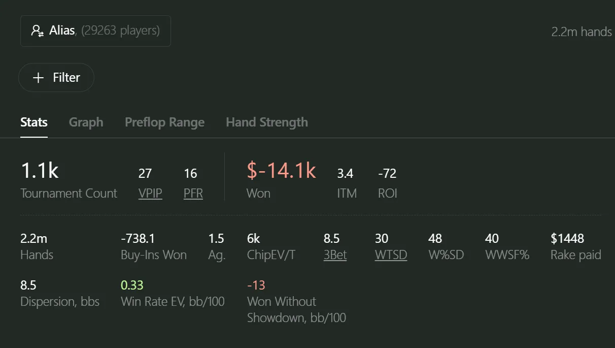 - Winnings in chips / cash / blinds / Chip EV / Paid rake / ROI / ITM