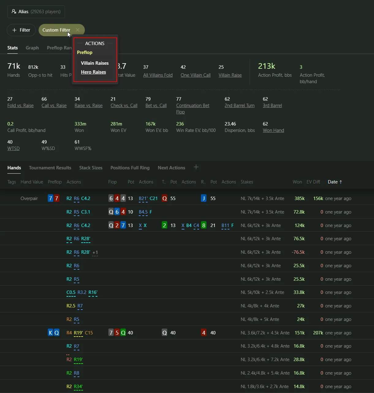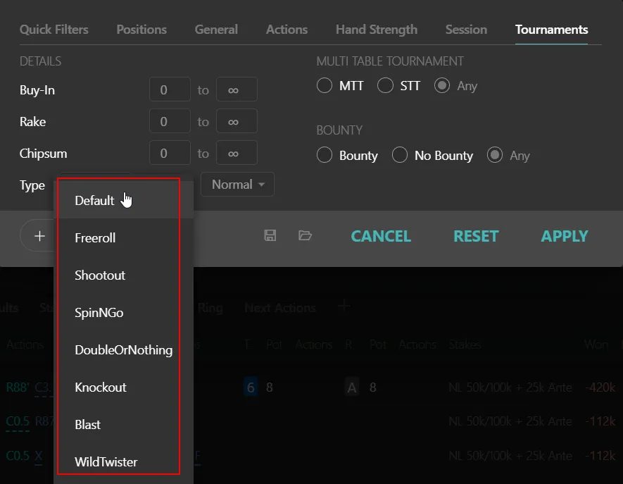 Every time you click on a line in a report, a new drilldown report opens, where you can apply additional filters to those specific hands.