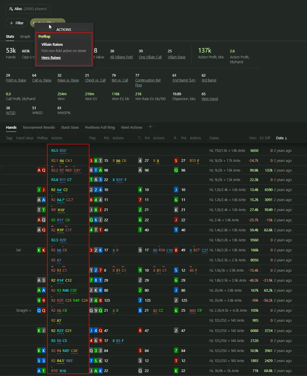 Then apply additional filters — for example, hole cards: