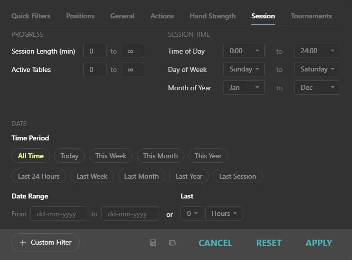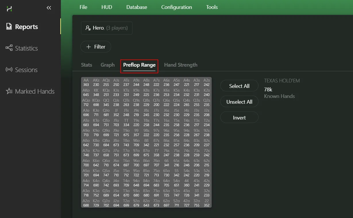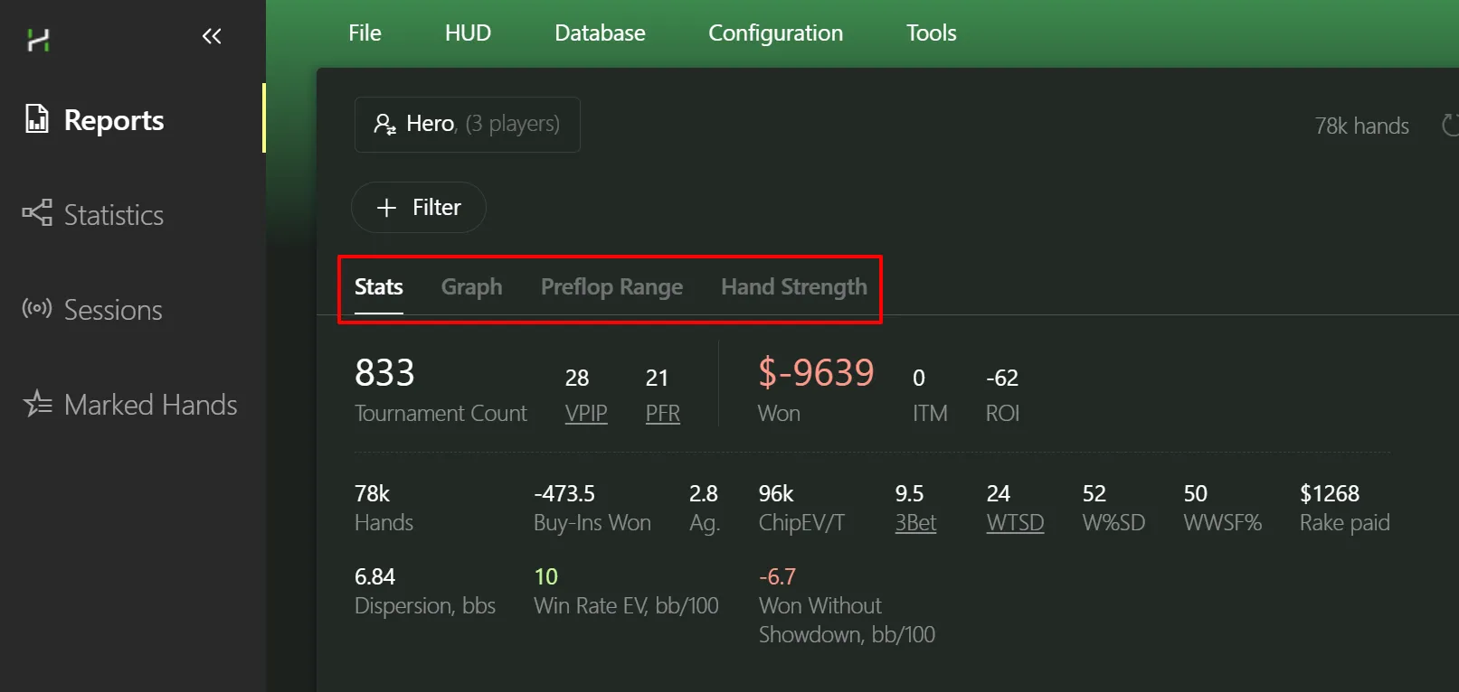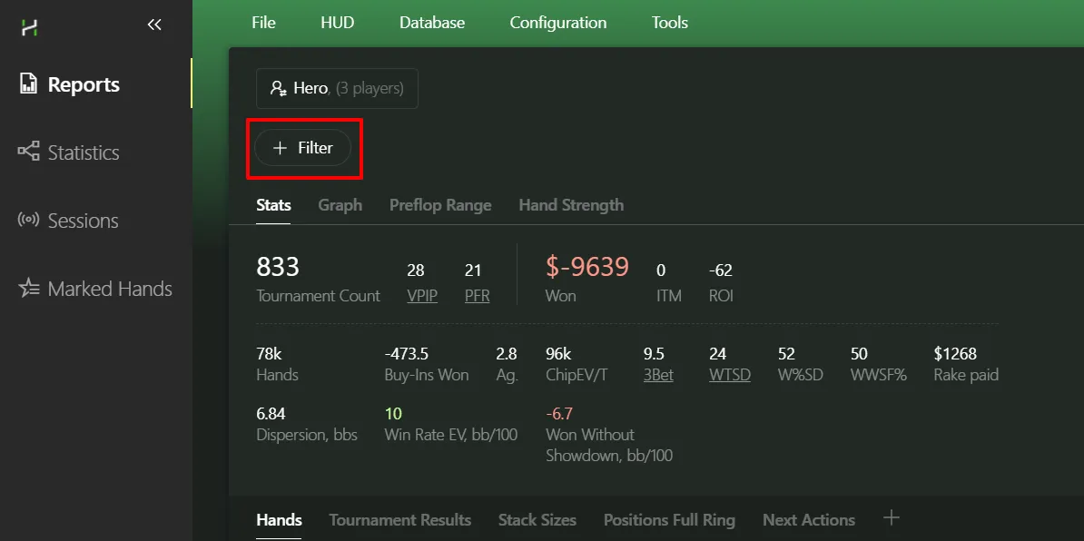The most important button in the tab - it’s the one we’ll use first to filter our hands. Open the Reports tab: