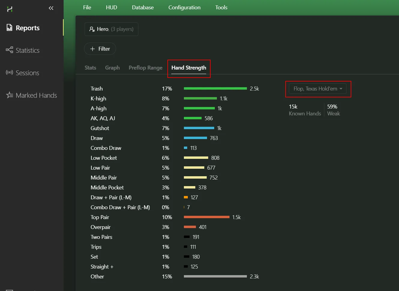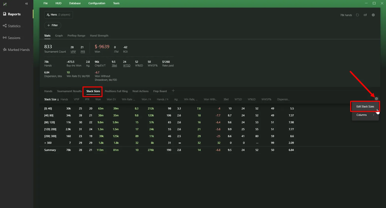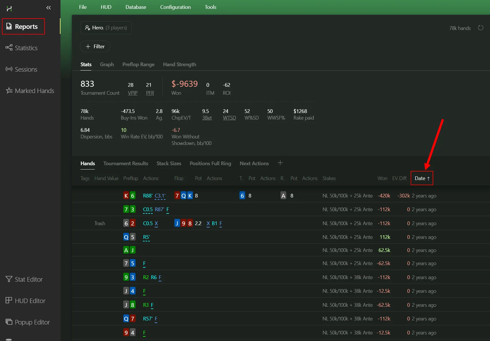 The most important button in the tab - it’s the one we’ll use first to filter our hands. Open the Reports tab: