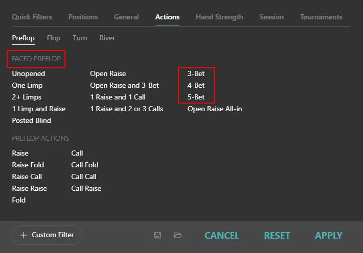 - Faced Action Preflop — what actions were made against us.