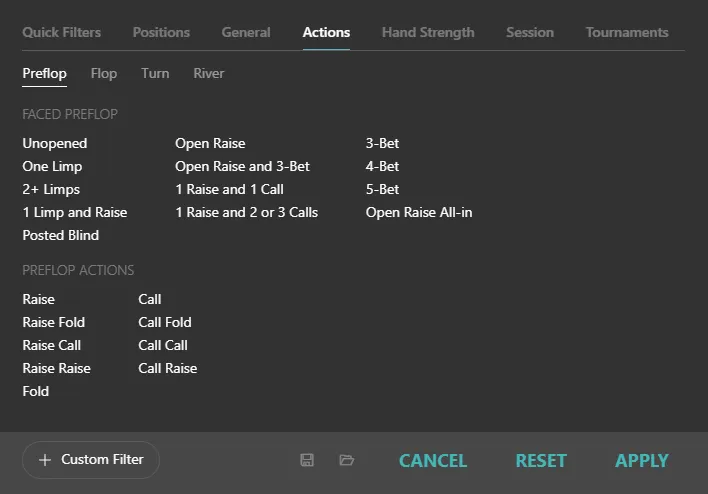 Next Action — shows your next action. Since no filters are applied, it shows only preflop actions.