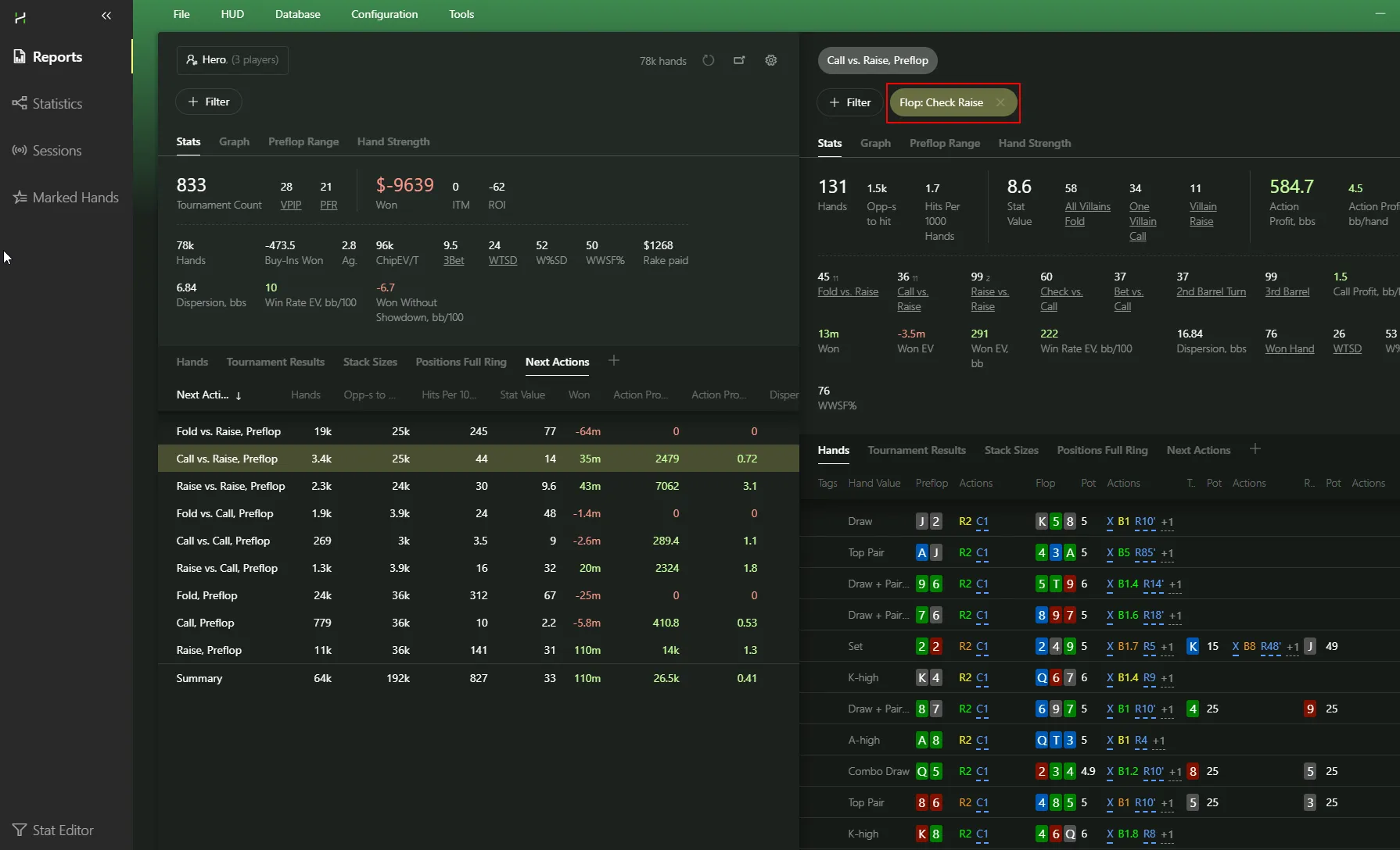 Every time you click on a line in a report, a new drilldown report opens, where you can apply additional filters to those specific hands.