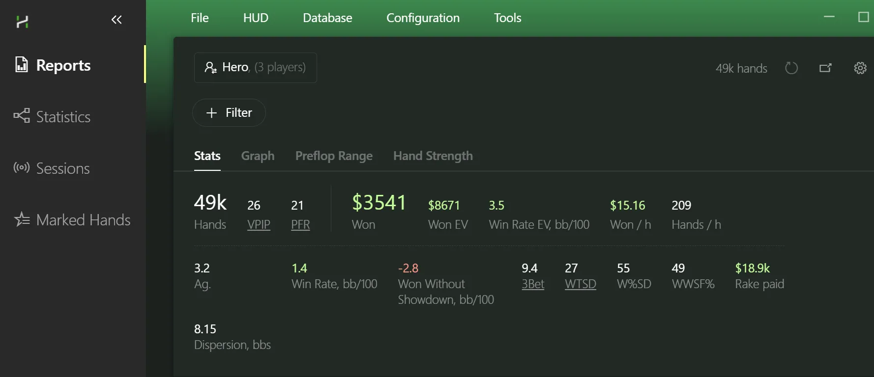 The most important button in the tab - it’s the one we’ll use first to filter our hands. Open the Reports tab: