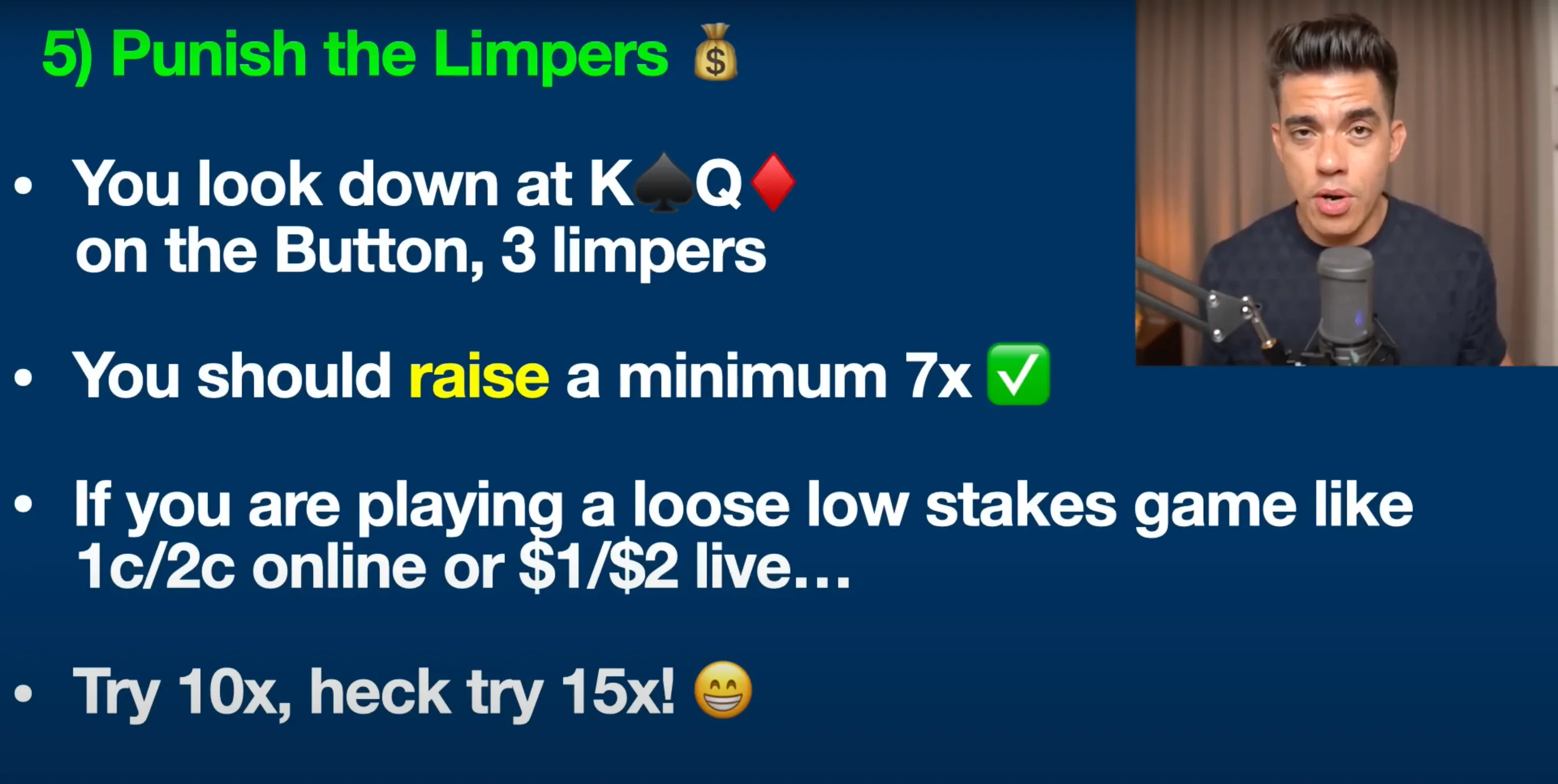 For example, if you have King-Queen on the button and there are three limpers, I recommend raising it to a minimum of seven times the blind. If you’re playing a $1/$2 cash game, that would be $2 * 7 = $14. Some people might still not fold, so the answer is simple: bump it up even more.