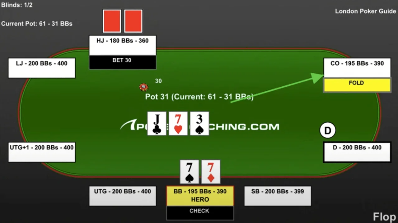 The initial pot is 16bb ($31), and a clearly tight opponent on MP c-bets immediately with a pot bet ($30) into both of you. The standard poker thinking would be: